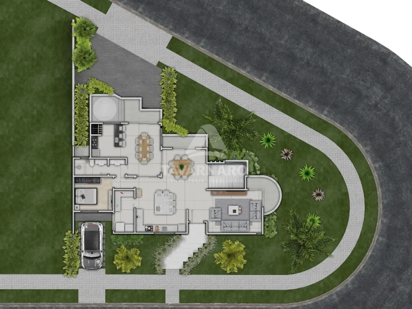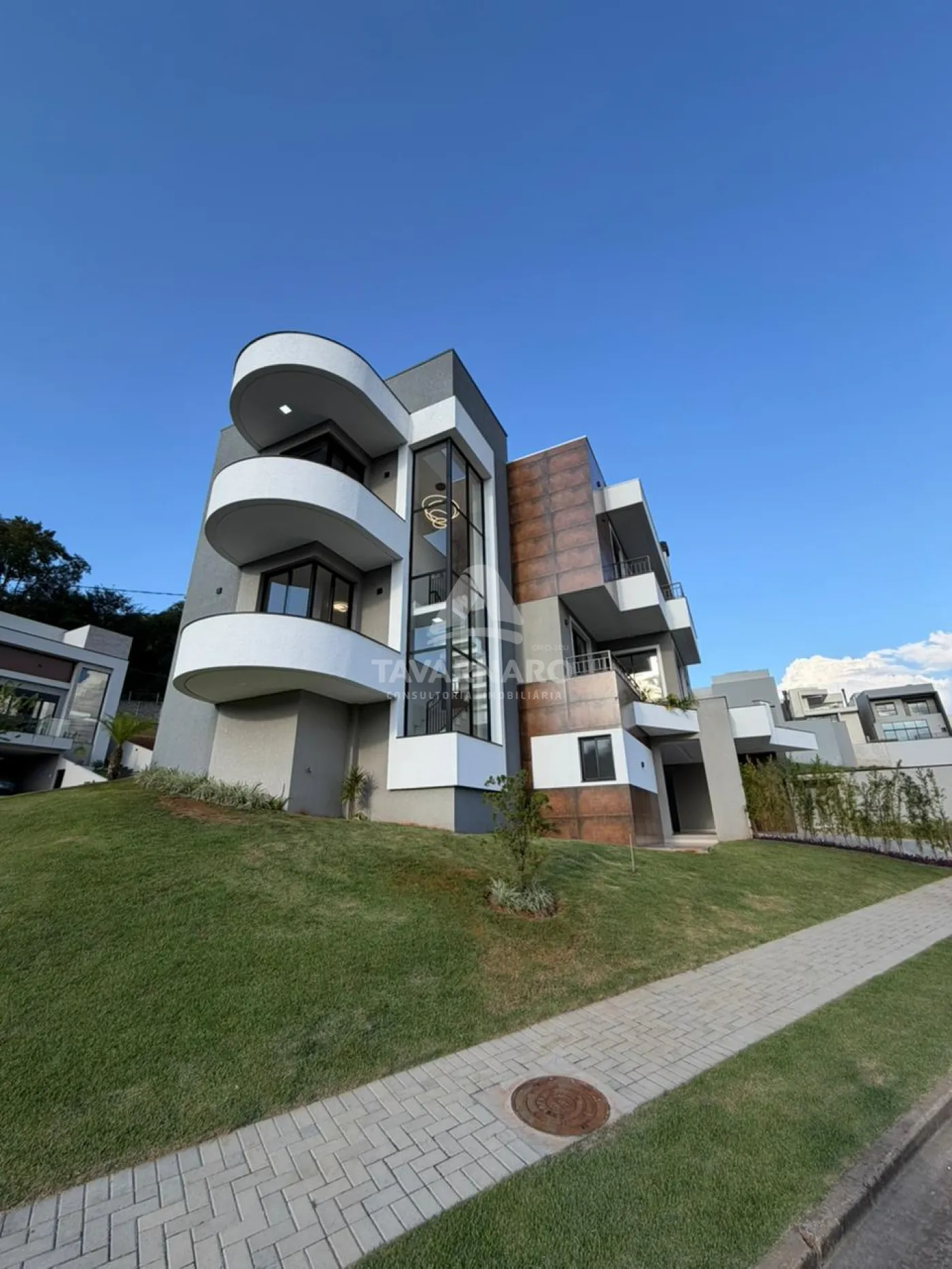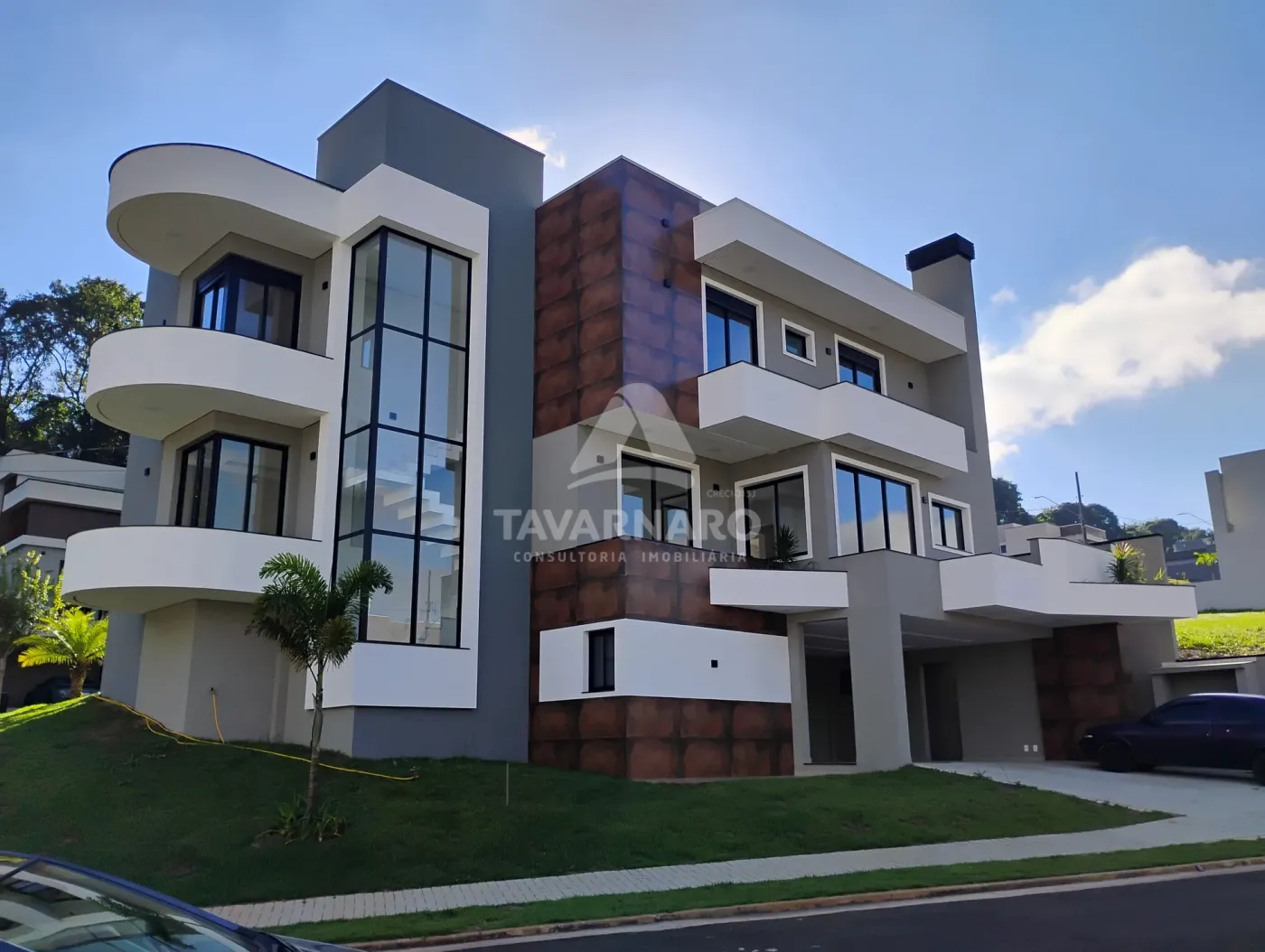O imóvel oferece 4 suítes (sendo 1 master e 1 no térreo), amplas salas de estar, jantar e TV (ou quarto), cozinha com bancada, lavanderia fechada e garagem para até 5 veículos, sendo 2 vagas cobertas.