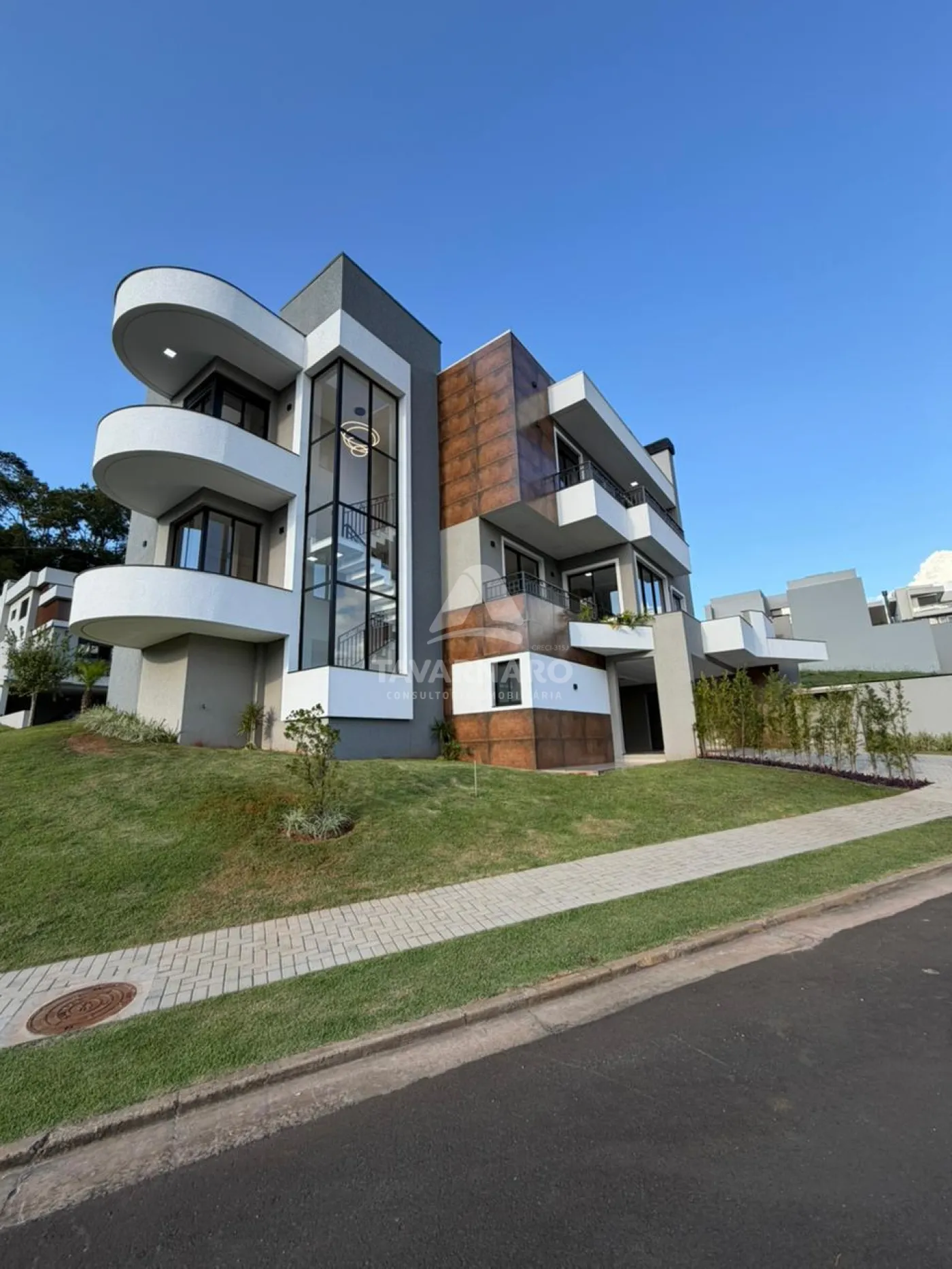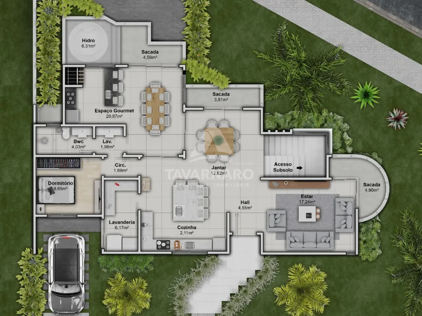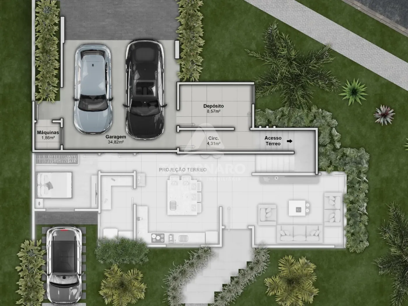 O imóvel oferece 4 suítes (sendo 1 master e 1 no térreo), amplas salas de estar, jantar e TV (ou quarto), cozinha com bancada, lavanderia fechada e garagem para até 5 veículos, sendo 2 vagas cobertas.