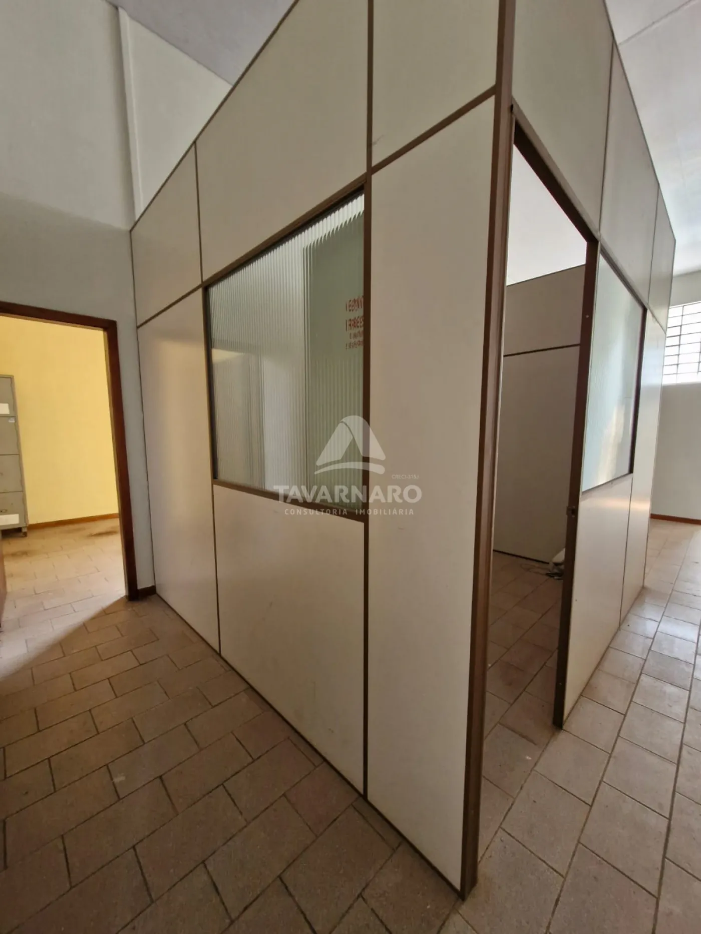 Escritório medindo 160m² com divisórias e sanitário, pé direito de aproximadamente 3 metros de altura, vagas e pátio compartilhados.