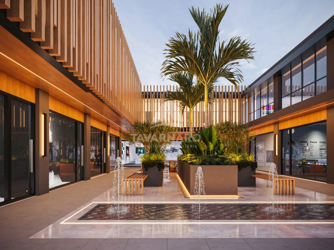O pavimento térreo das lojas possui um Hall de entrada com área de convivência com fonte decorativa, mesas e jardim, banheiro feminino, banheiro masculino, banheiro PNE, sala técnica de segurança, DML, acesso a escada e elevador. No Pavimento superior há 3 sanitários, 1 sala de área técnica, 1 DML e 1 depósito.