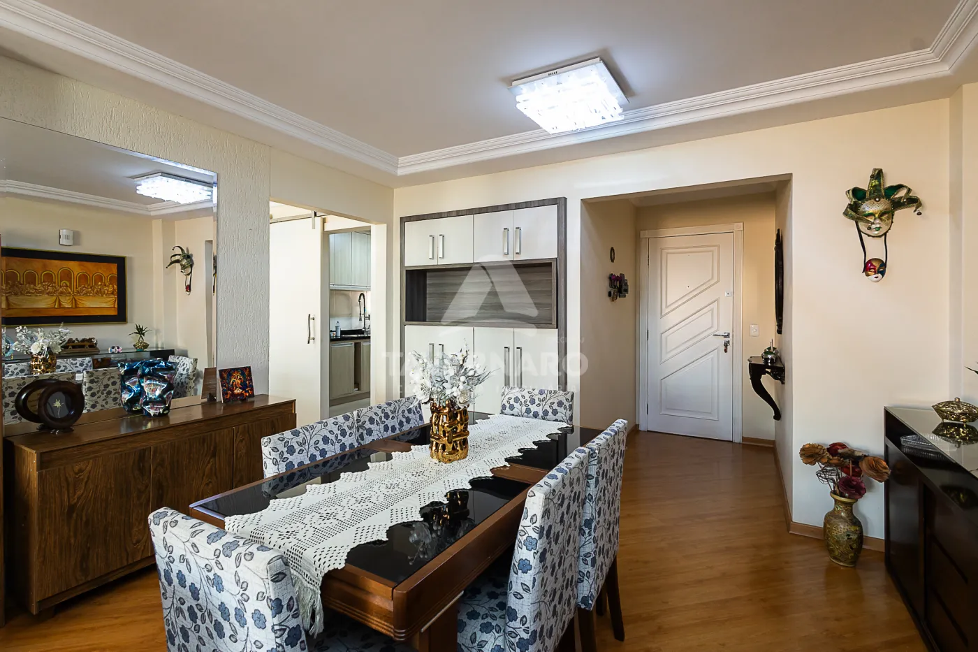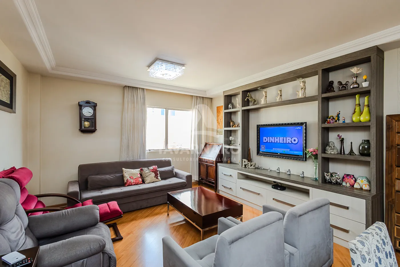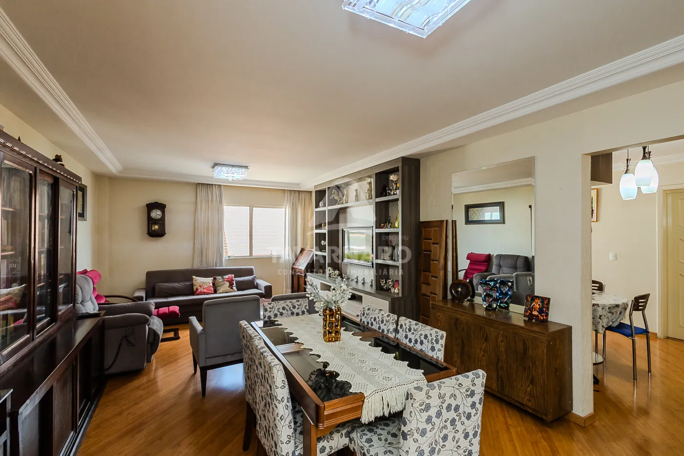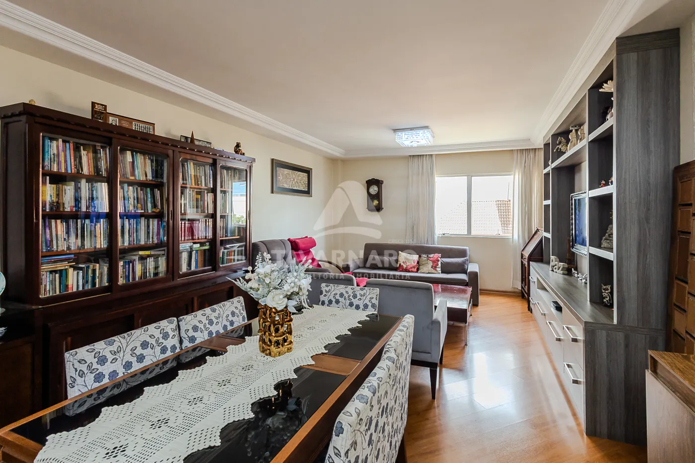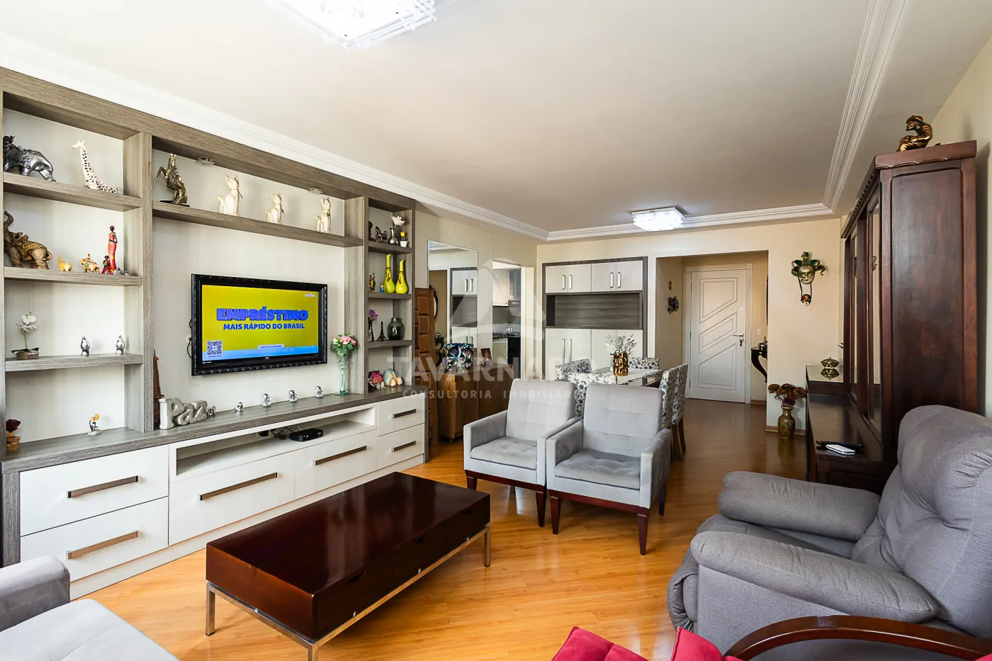 sala de estar e TV integrada com à sala de jantar, cozinha com móveis planejados