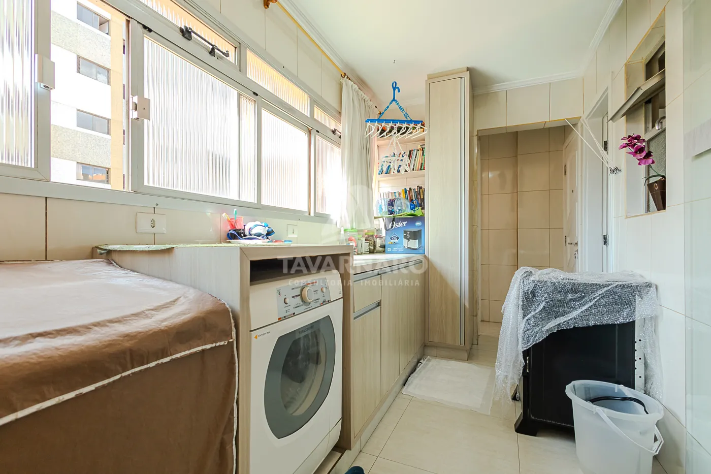 área de serviço com armários planejados, banheiro e depósito