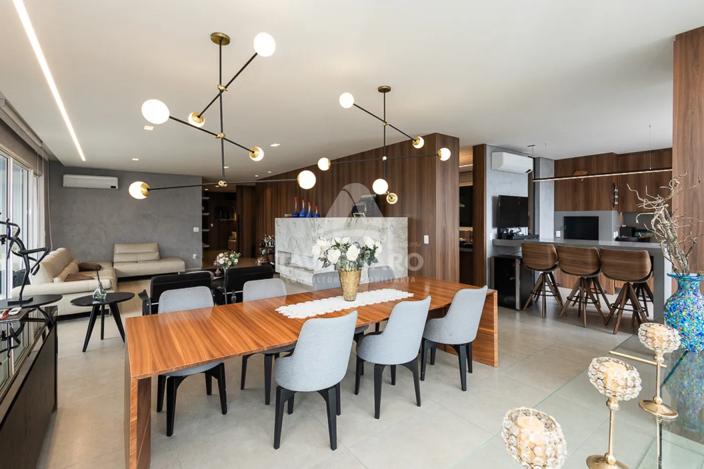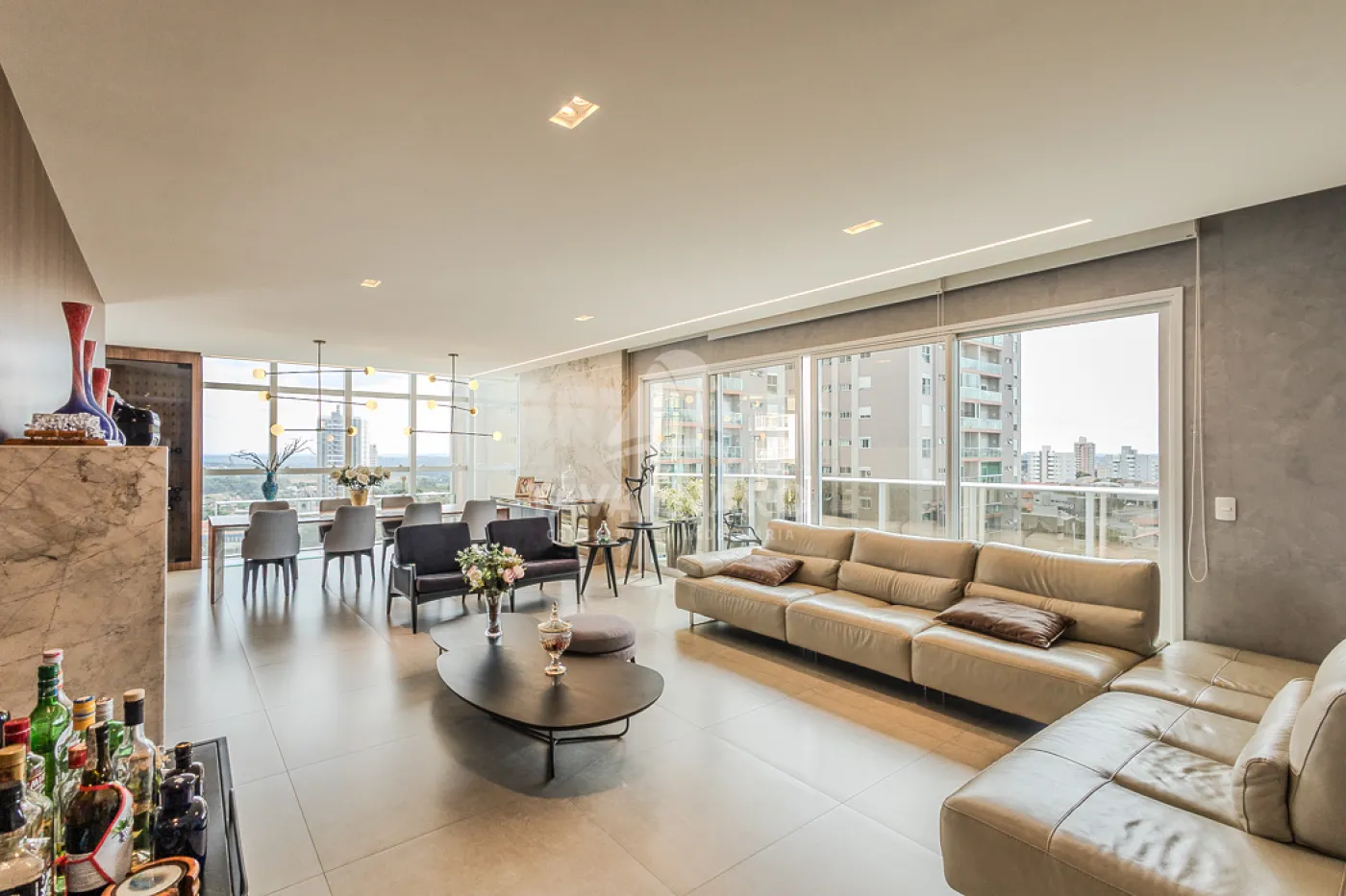 O hall de entrada dá as boas-vindas a um ambiente sofisticado que se conecta à ampla sala de estar e à elegante sala de jantar, ideais para momentos de convivência.