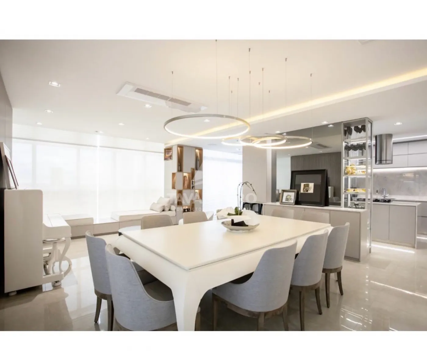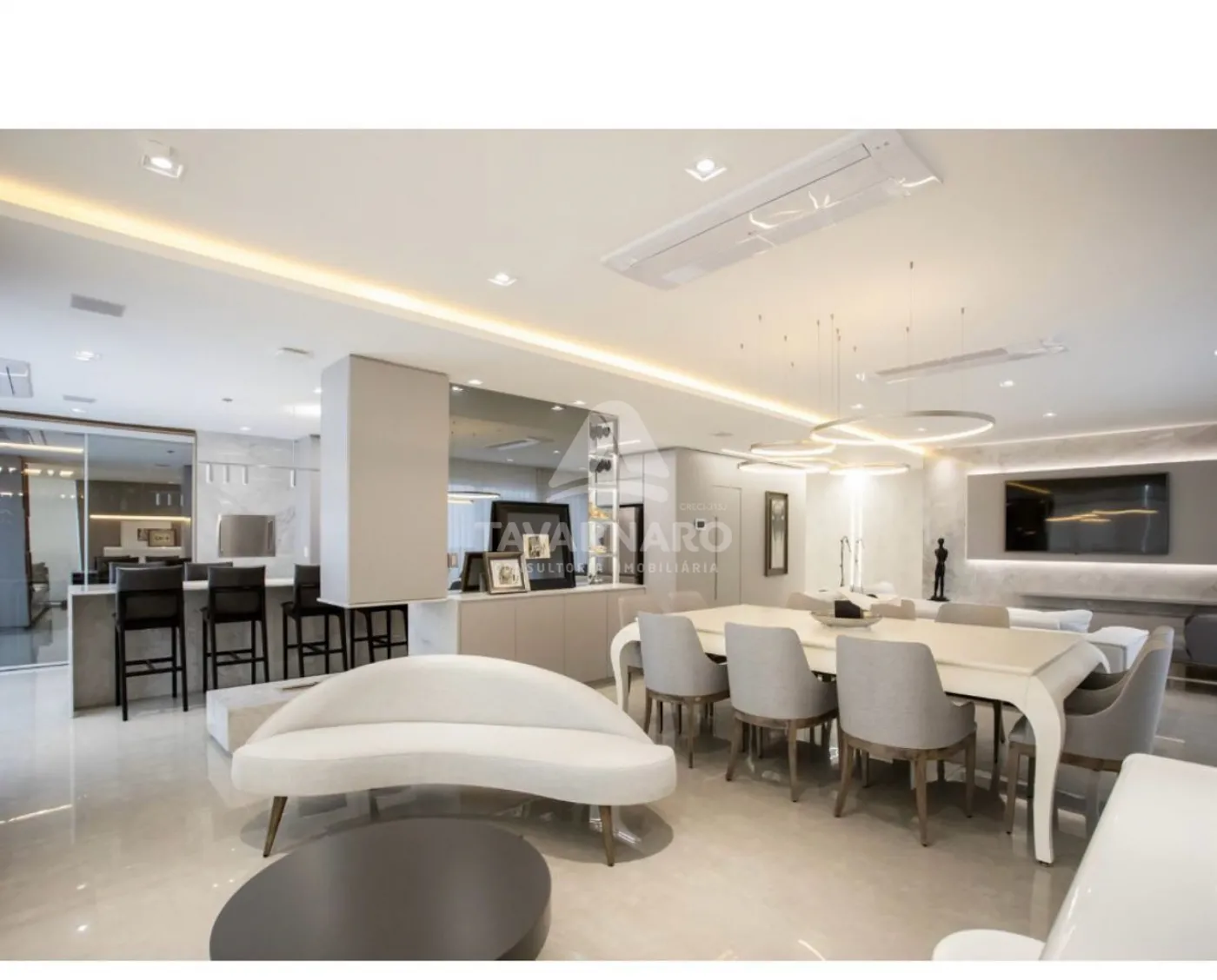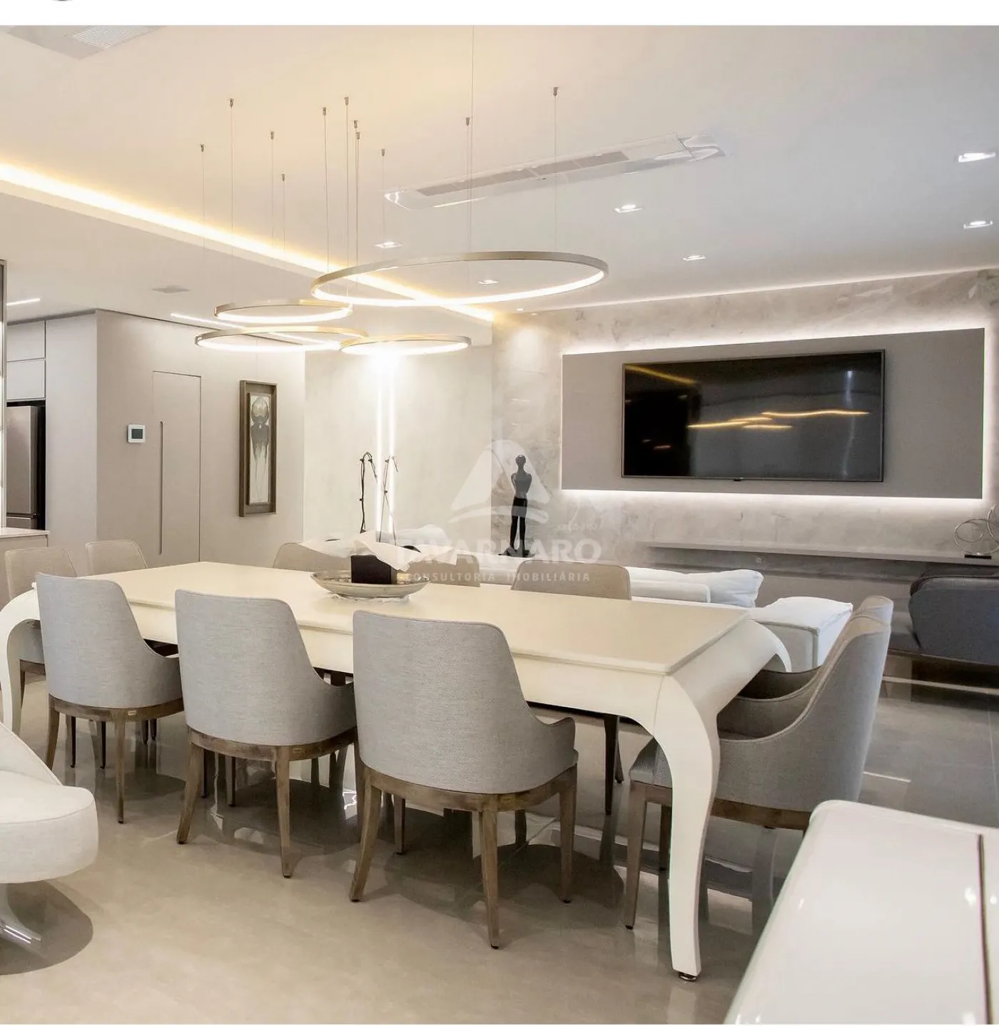 Sala de estar ampla com ambientes integrados e cores claras que compõe