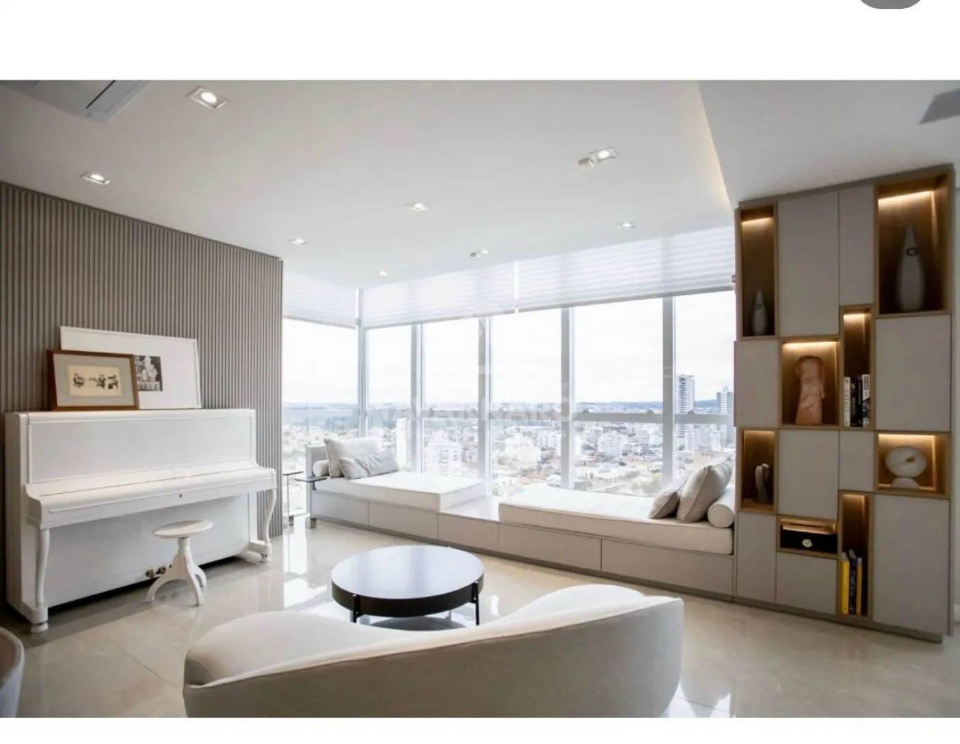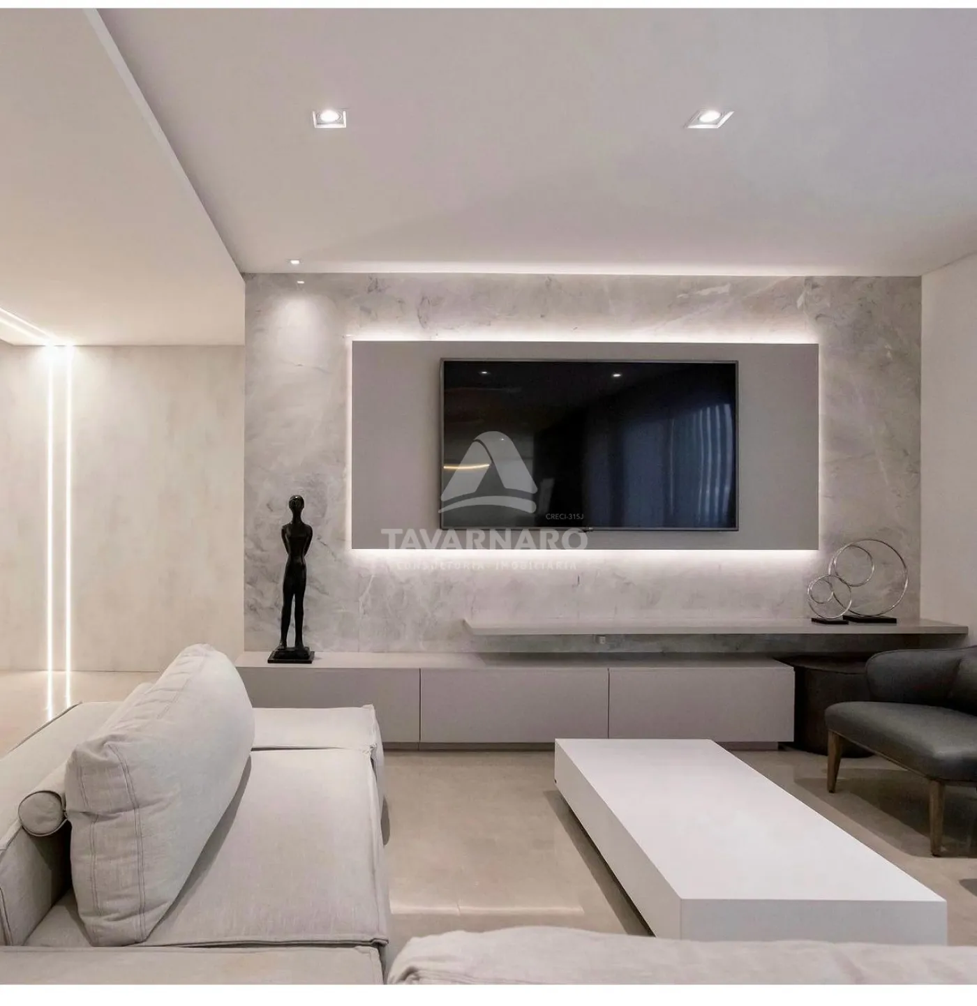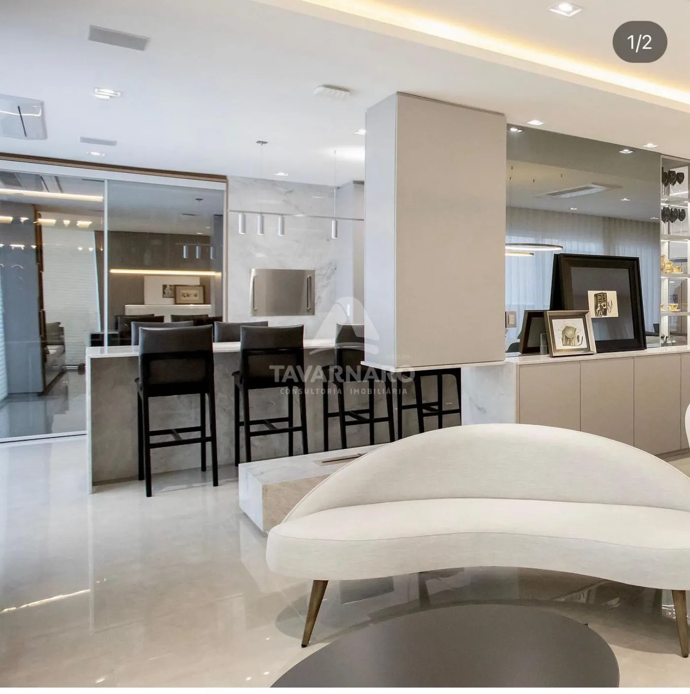 Sala de estar ampla com ambientes integrados e cores claras que compõe