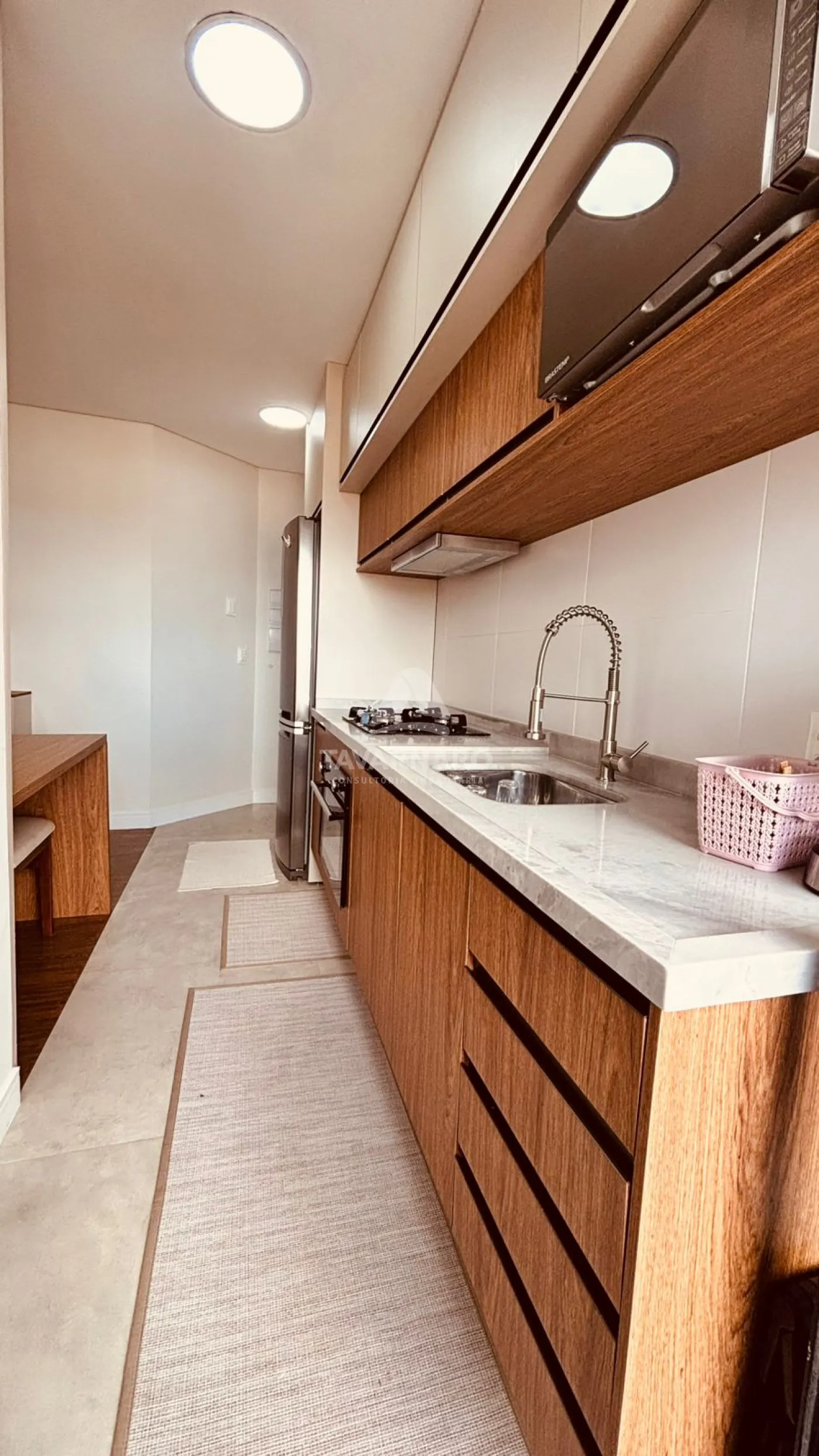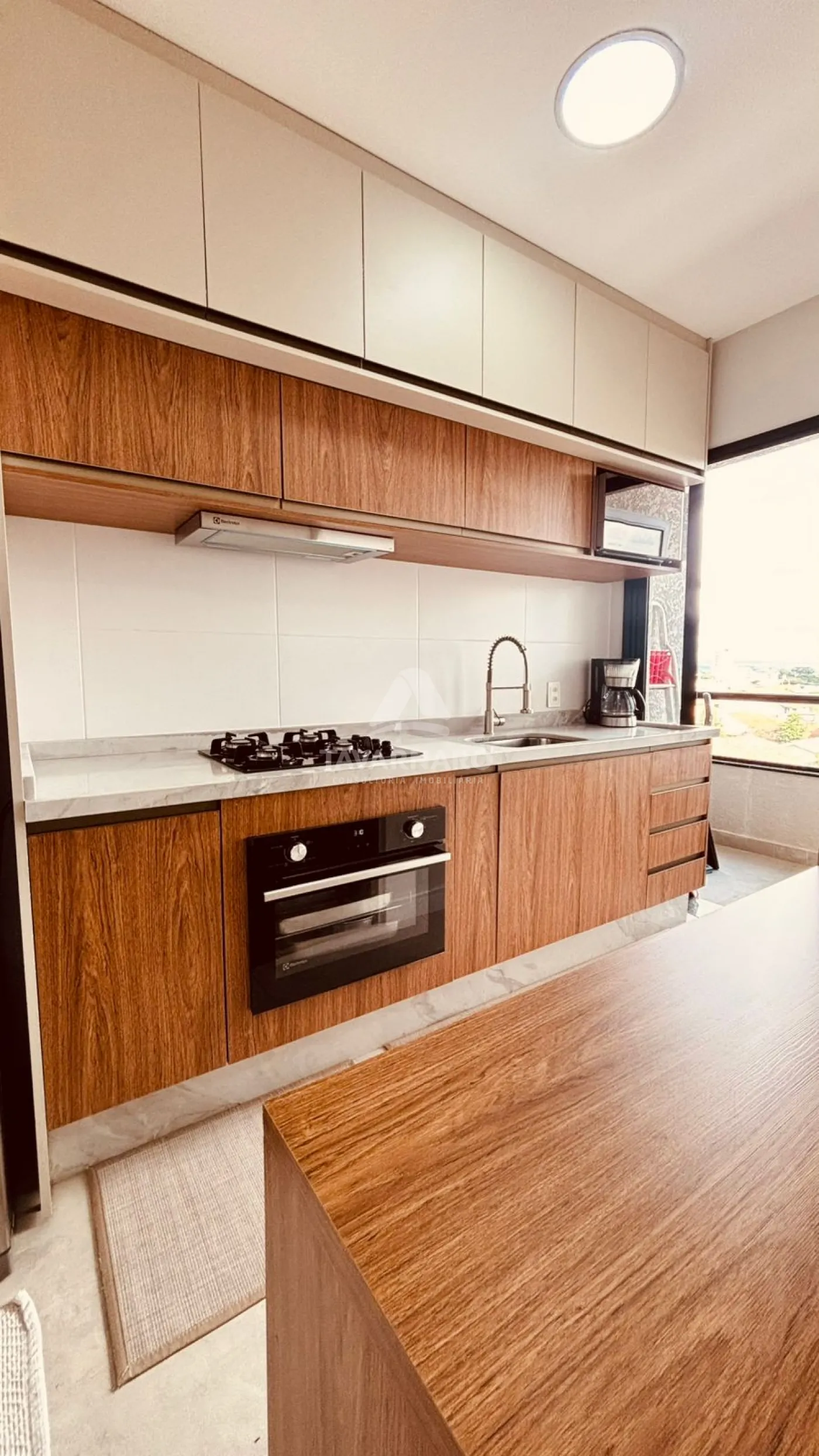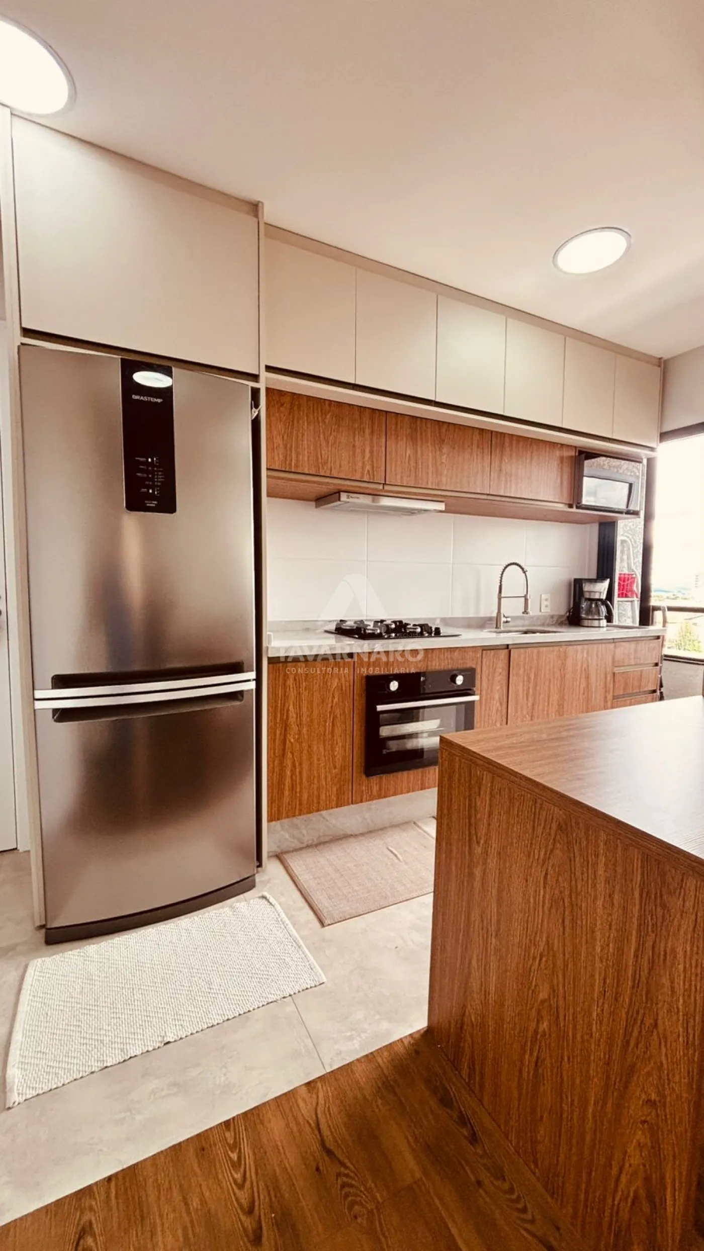 A cozinha é totalmente planejada, com móveis sob medida que unem funcionalidade e elegância. Os banheiros também são planejados, trazendo organização e um acabamento moderno.