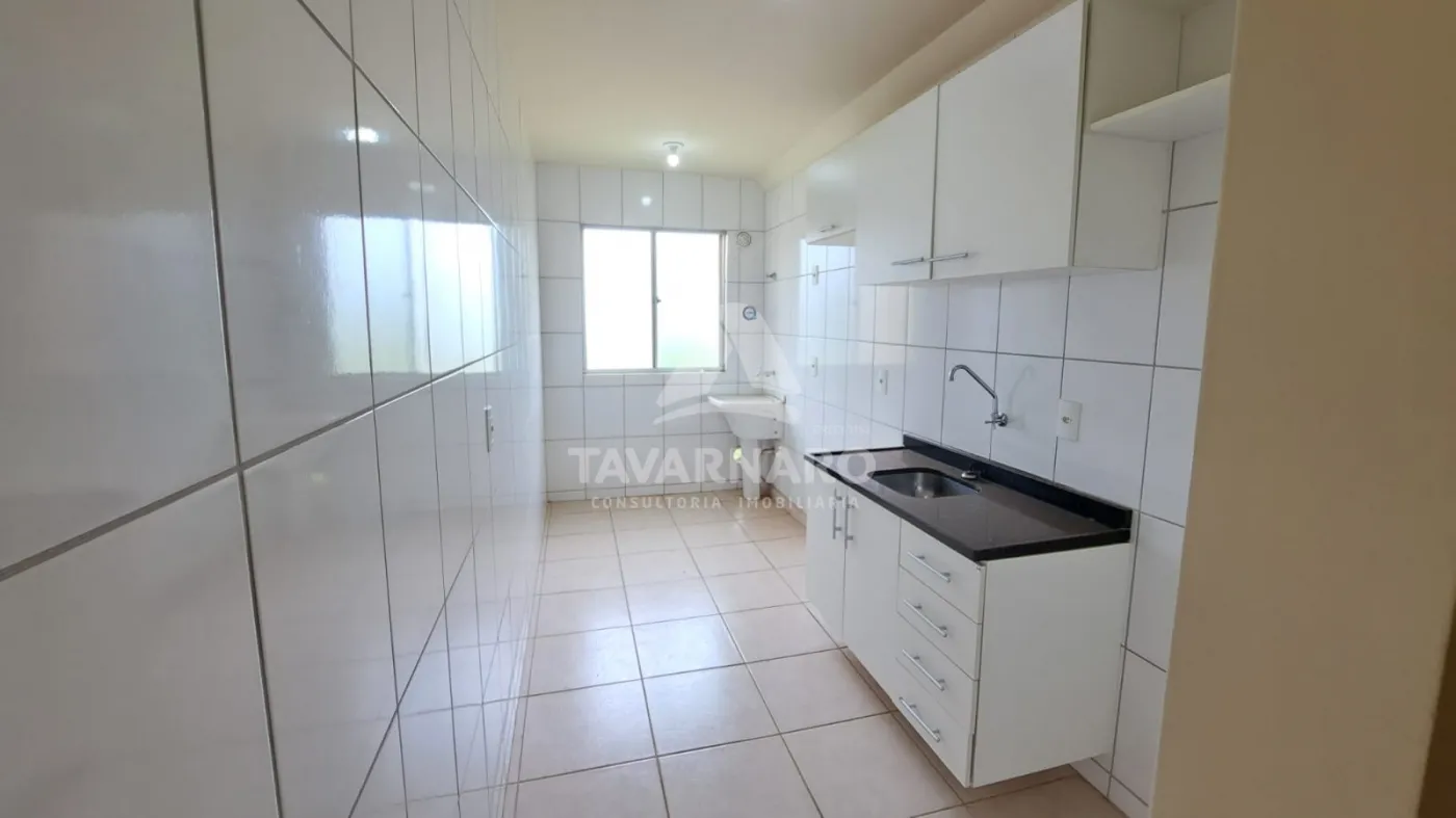 2 dormitórios, sala para 2 ambientes com sacada, cozinha com armários, área de serviço, banheiro social e uma vaga de estacionamento.