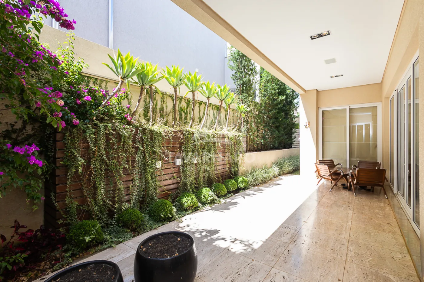 A área externa e sacadas recebem acabamento em travertino e granito.