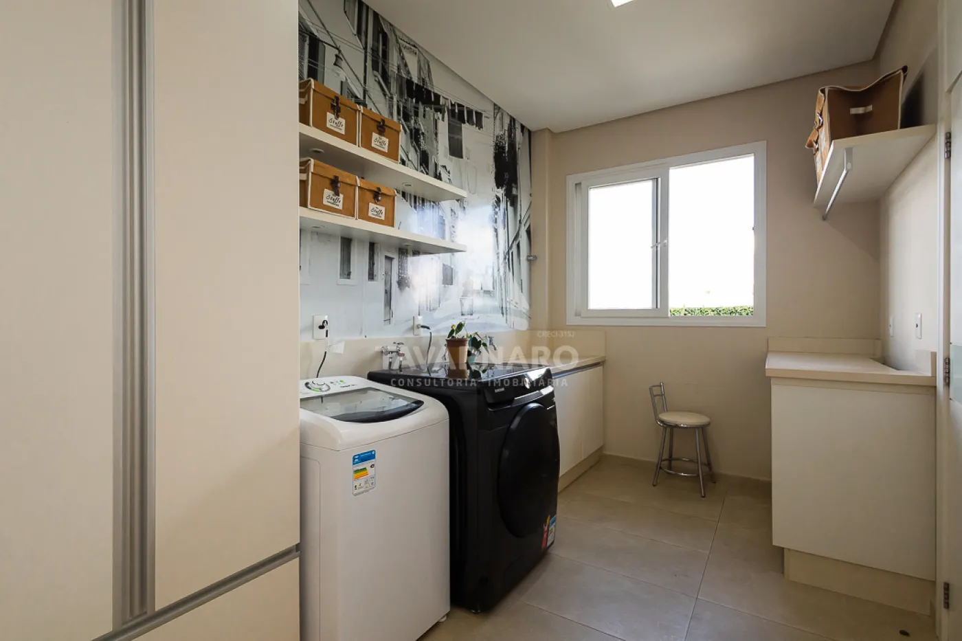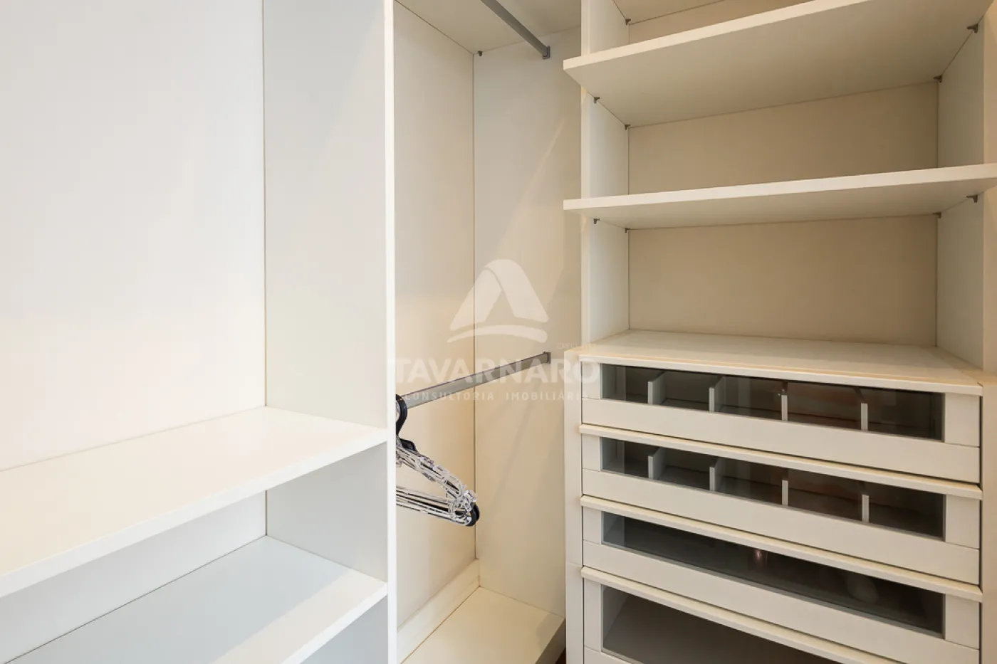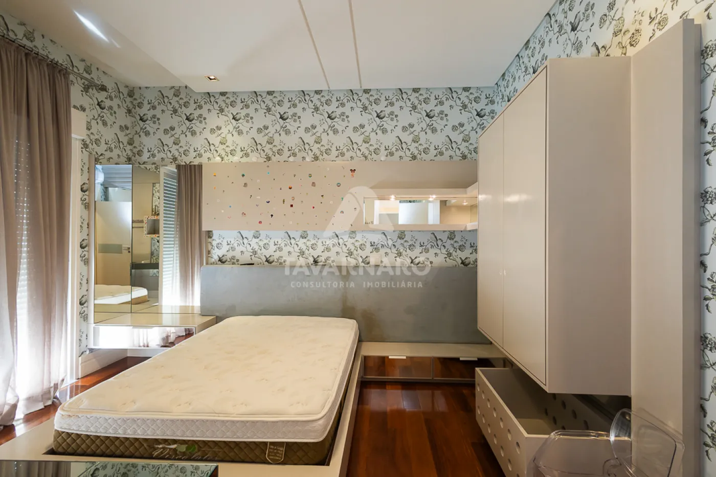 Os móveis planejados (closet, cozinha, roupeiros, home, escritório e churrasqueira) são assinados pela Florense e executados sob medida, com projeto personalizado.