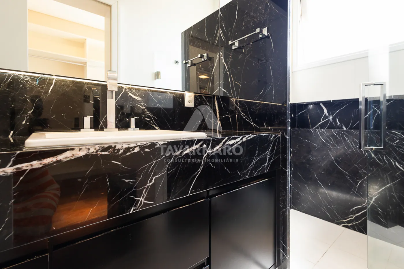 O pavimento inferior é todo revestido em mármore, assim como os banheiros.