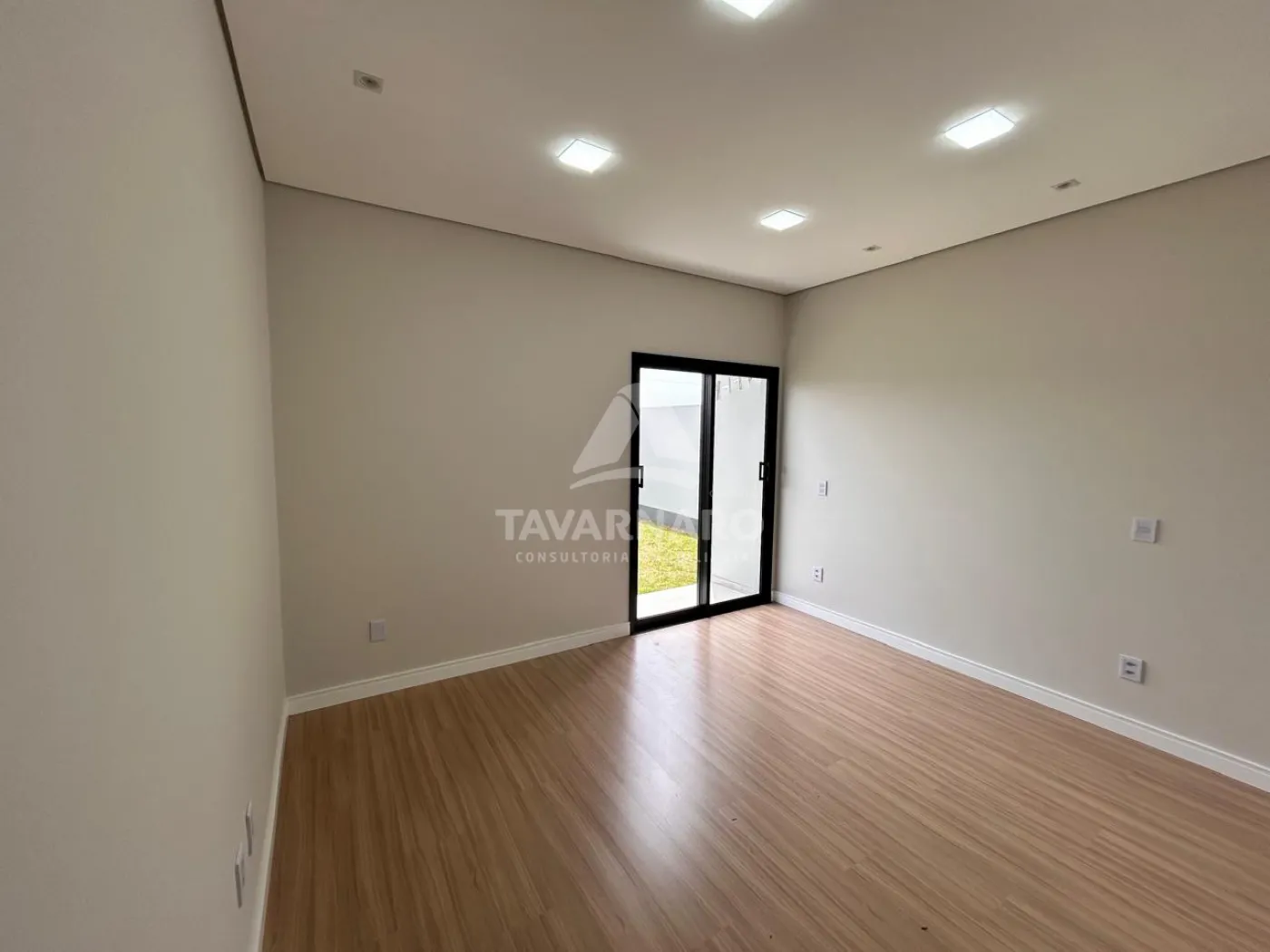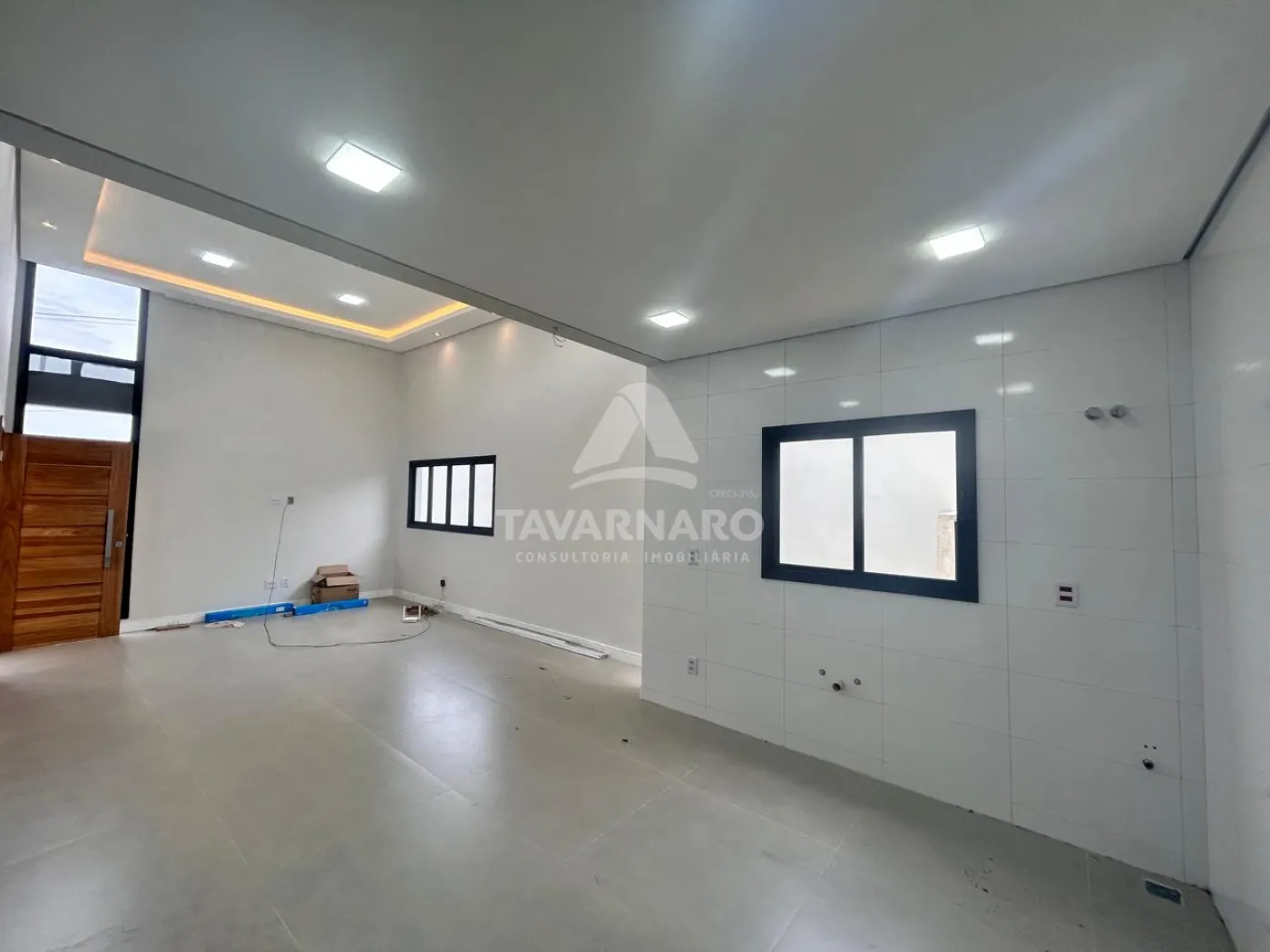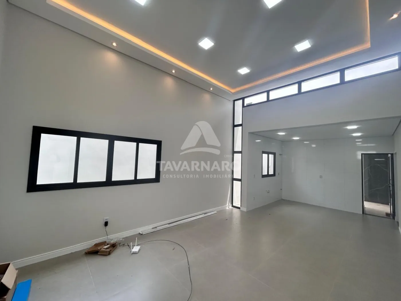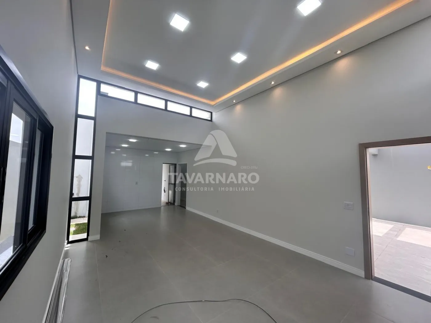 A sala ampla possui pé-direito alto, iluminação embutida e projeto luminotécnico aparente, garantindo um ambiente sofisticado e bem iluminado.