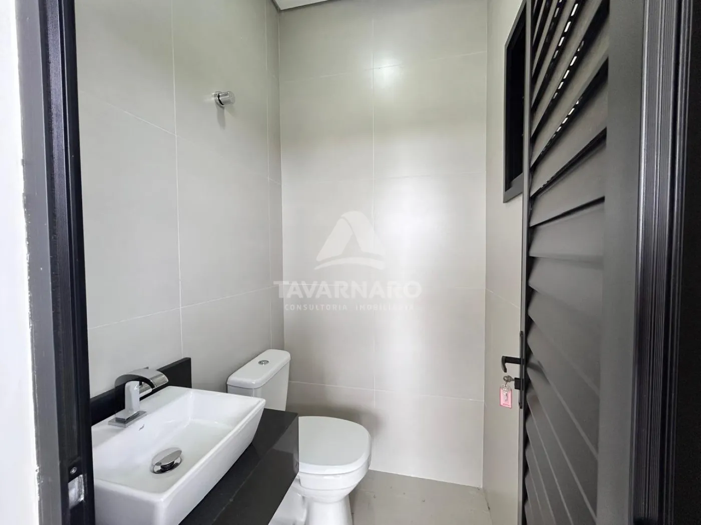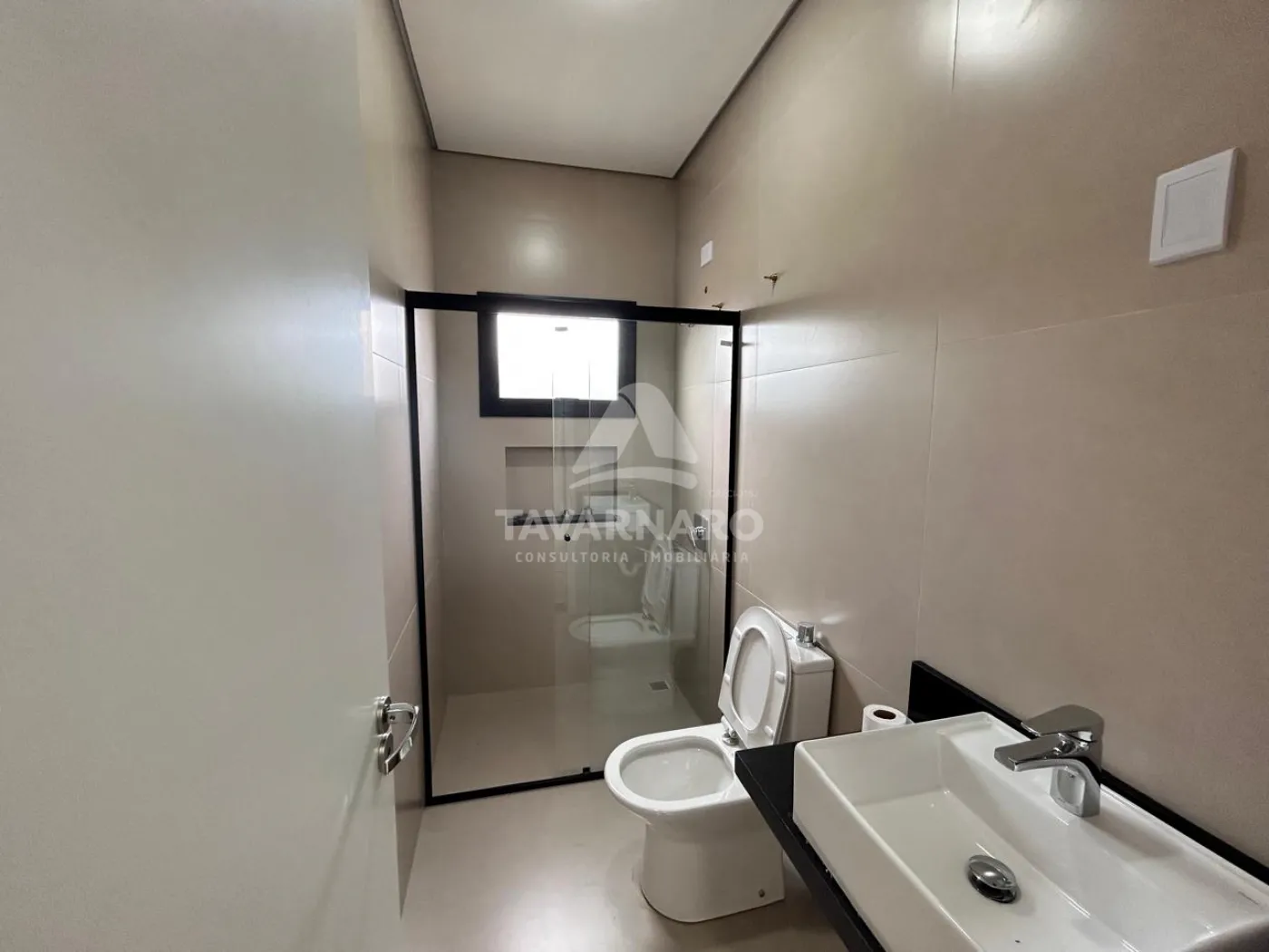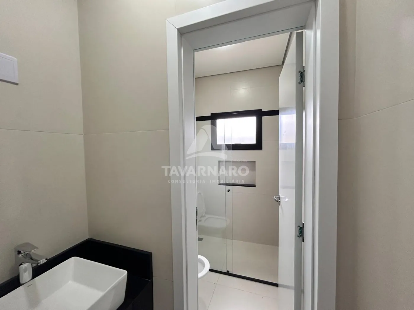 Os banheiros seguem um estilo moderno, com box em vidro, bancada preta e ventilação natural por janelas.