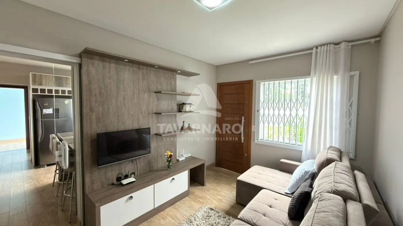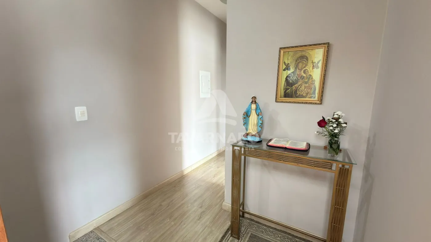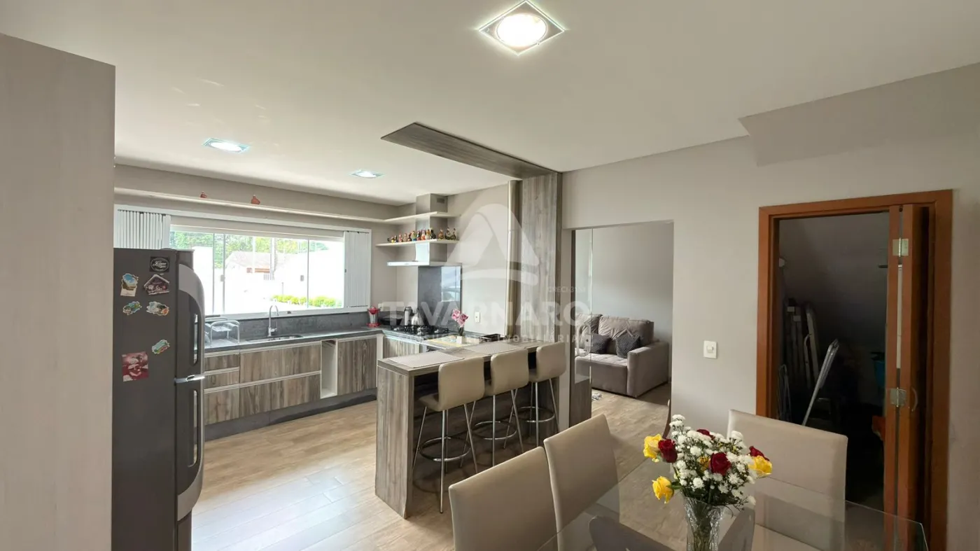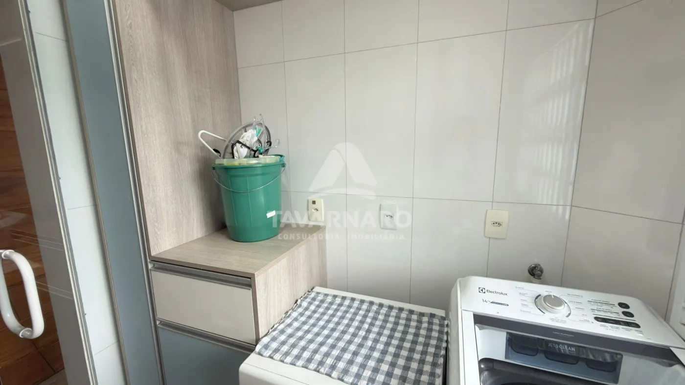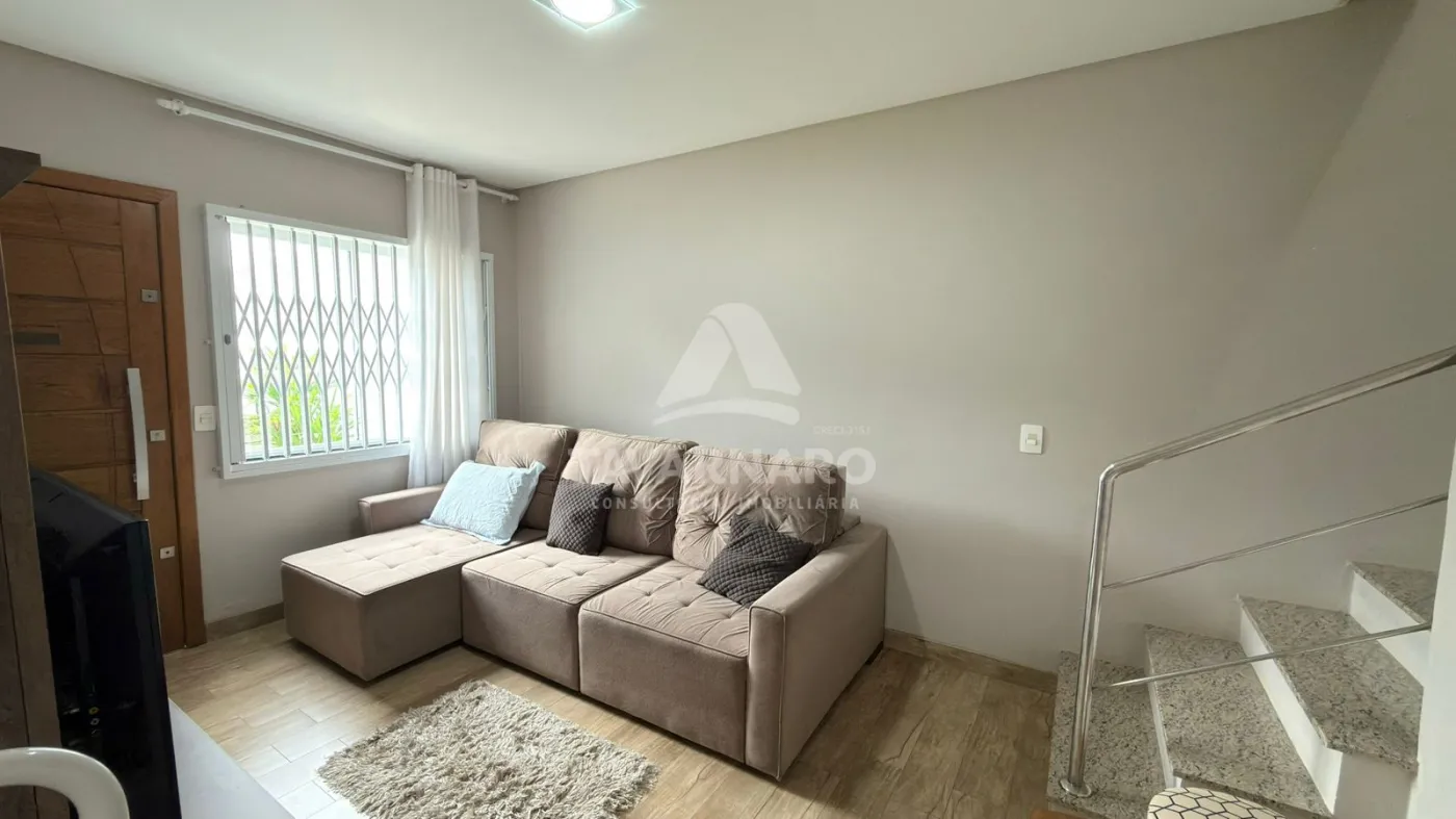 No térreo possui cozinha com planejados, sala de estar, lavabo e área de serviço com garagem para um carro e churrasqueira.