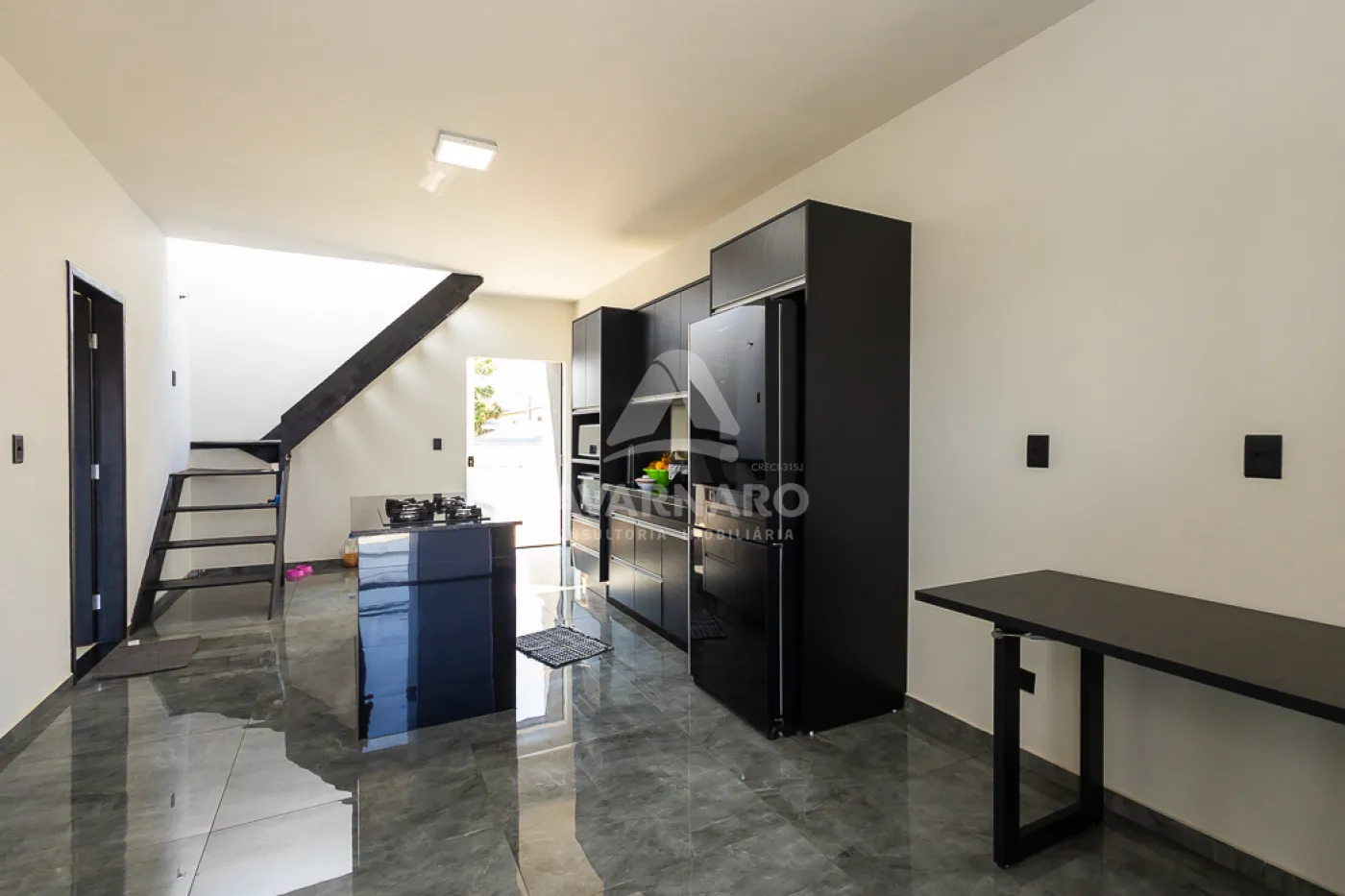 No piso superior possui sala, cozinha, 2 quartos, sendo um uma suíte, despensa, banheiro social, sacada com churras queira, lavanderia, laje com um banheiro e churrasqueira.