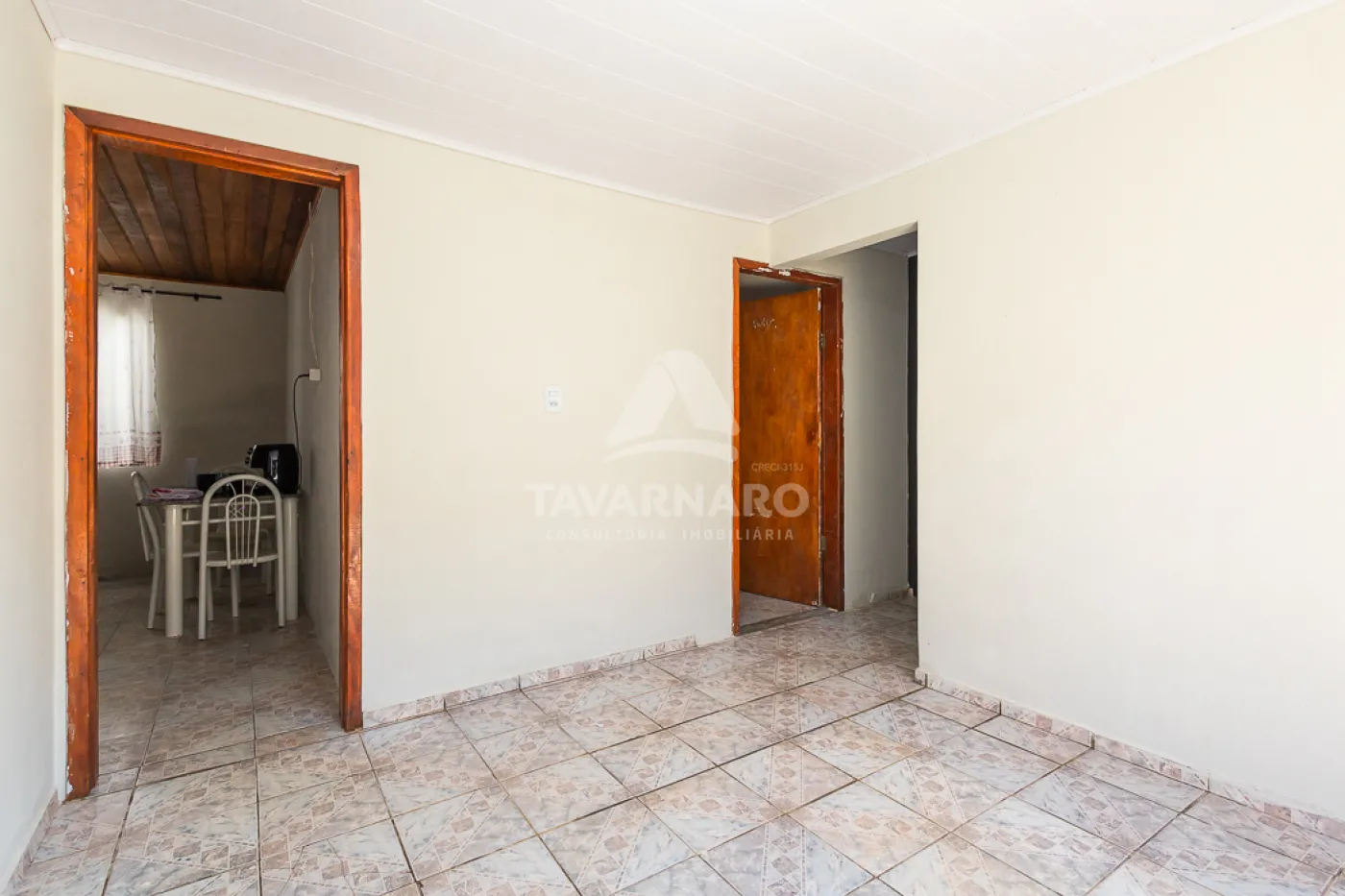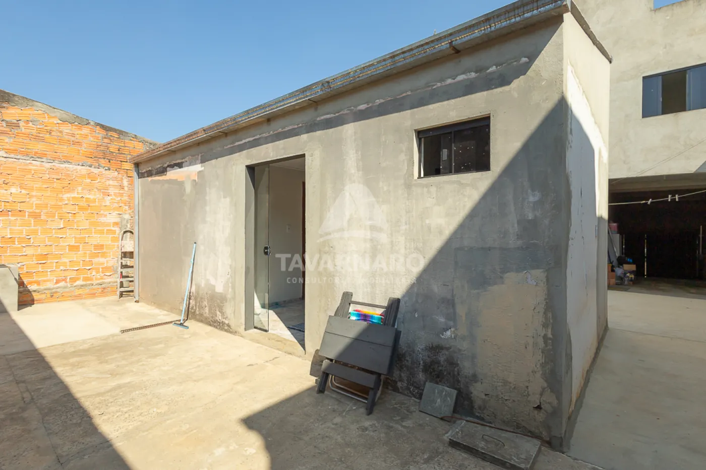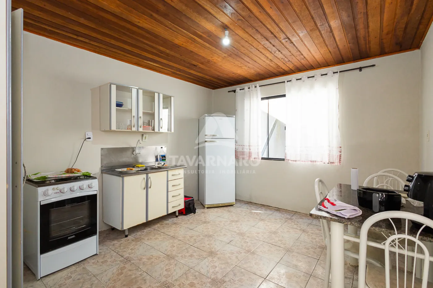 Ao fundo, uma casa em alvenaria com forro em madeira e PVC com 2 quartos, sala, cozinha e banheiro com pouca sobra de terreno.