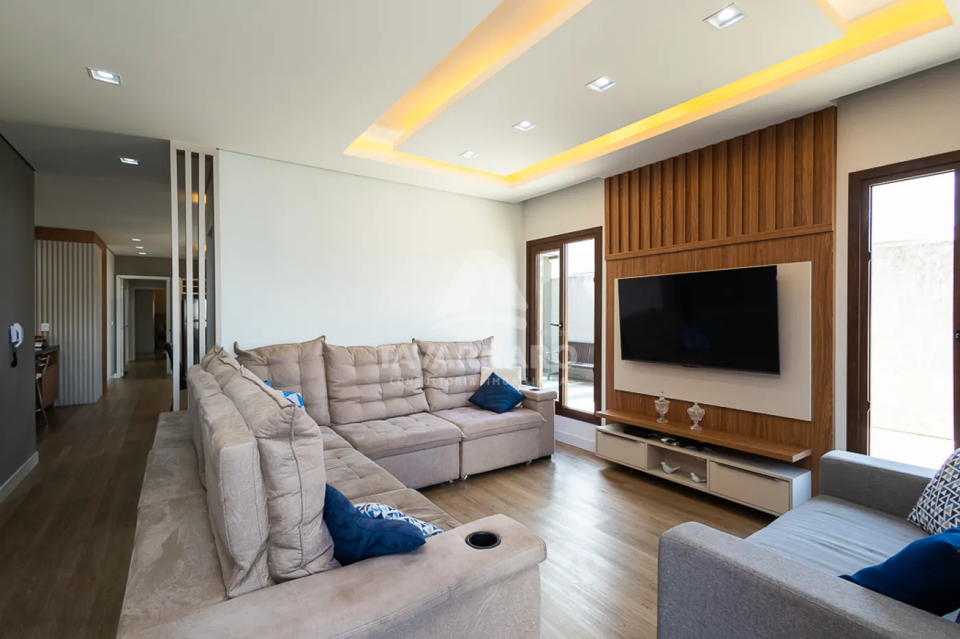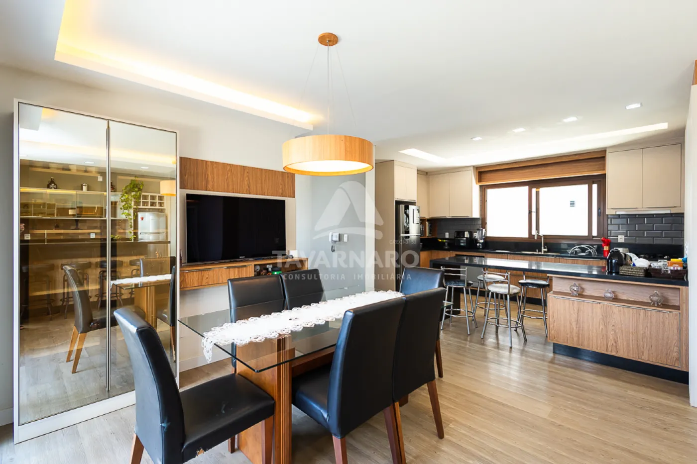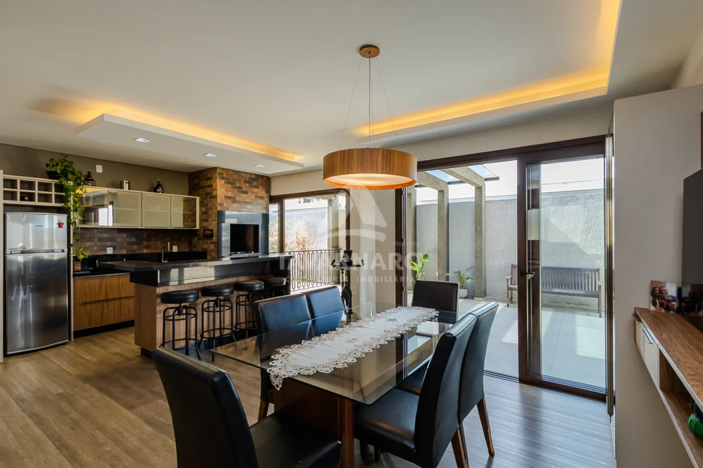 Sala de estar integrado a sala de jantar, cozinha e espaço gourmet;