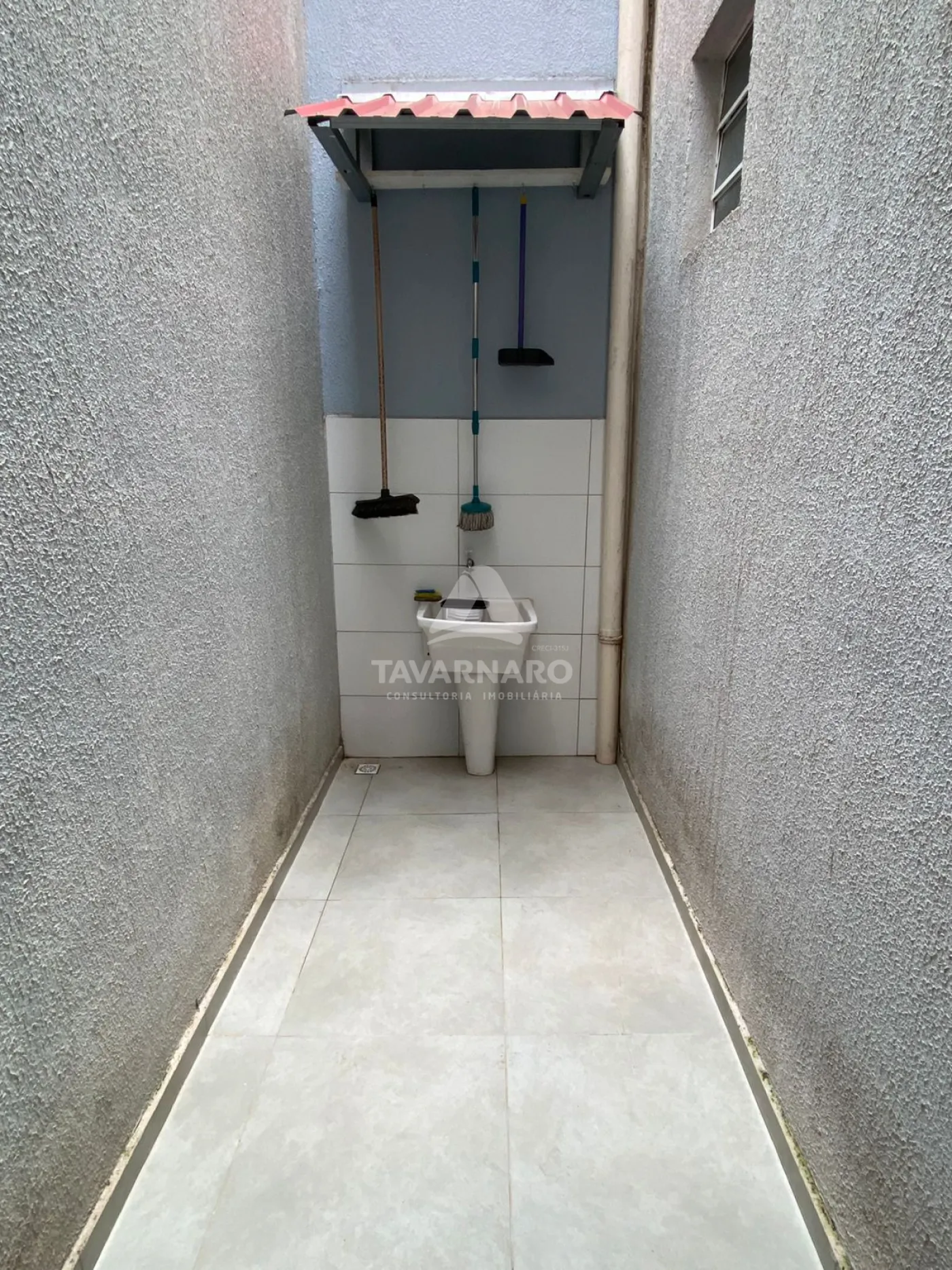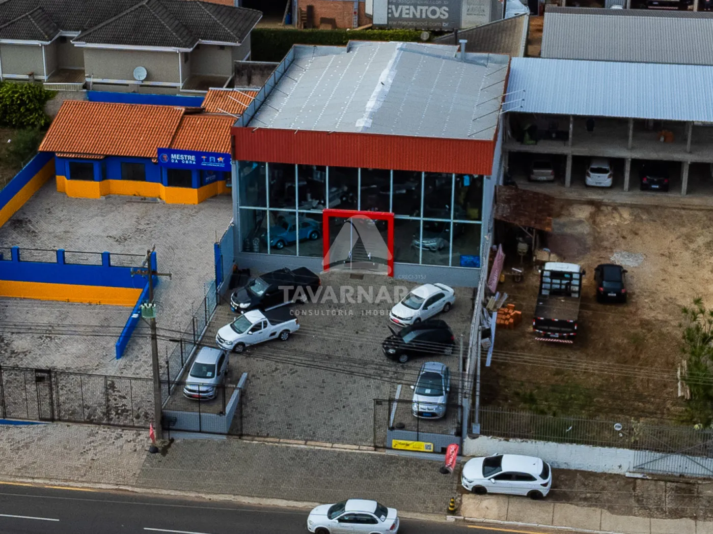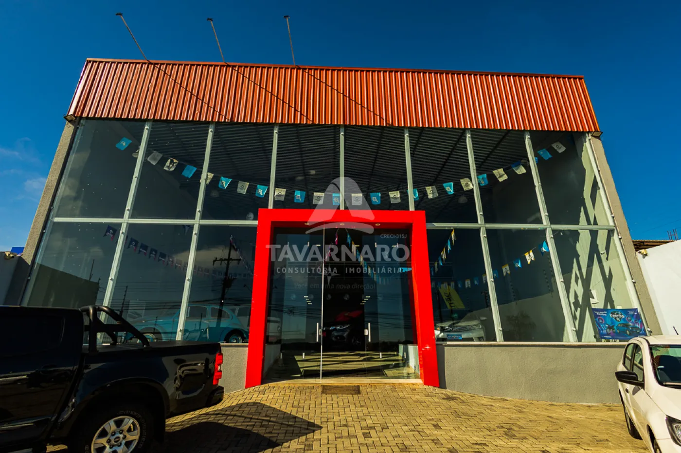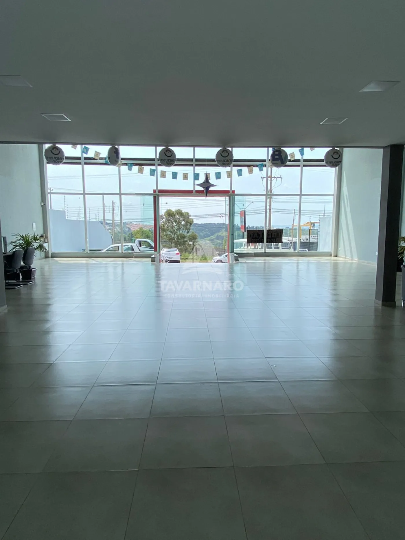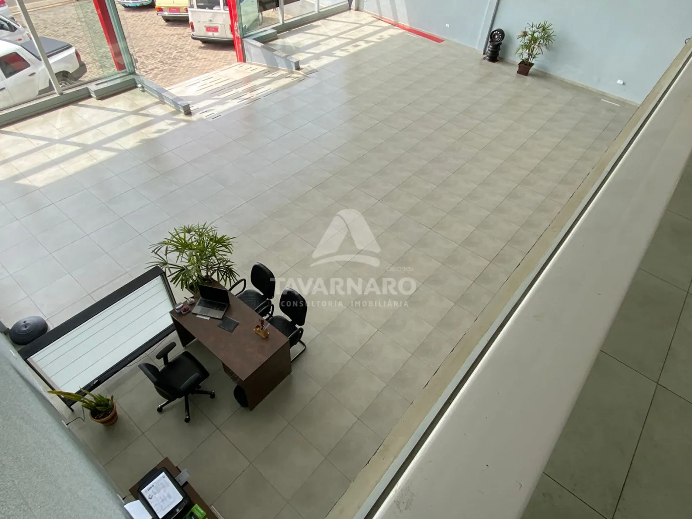 Térreo possui salão de atendimento com vitrine em vidro, sanitários, área de serviço e pátio de estacionamento.