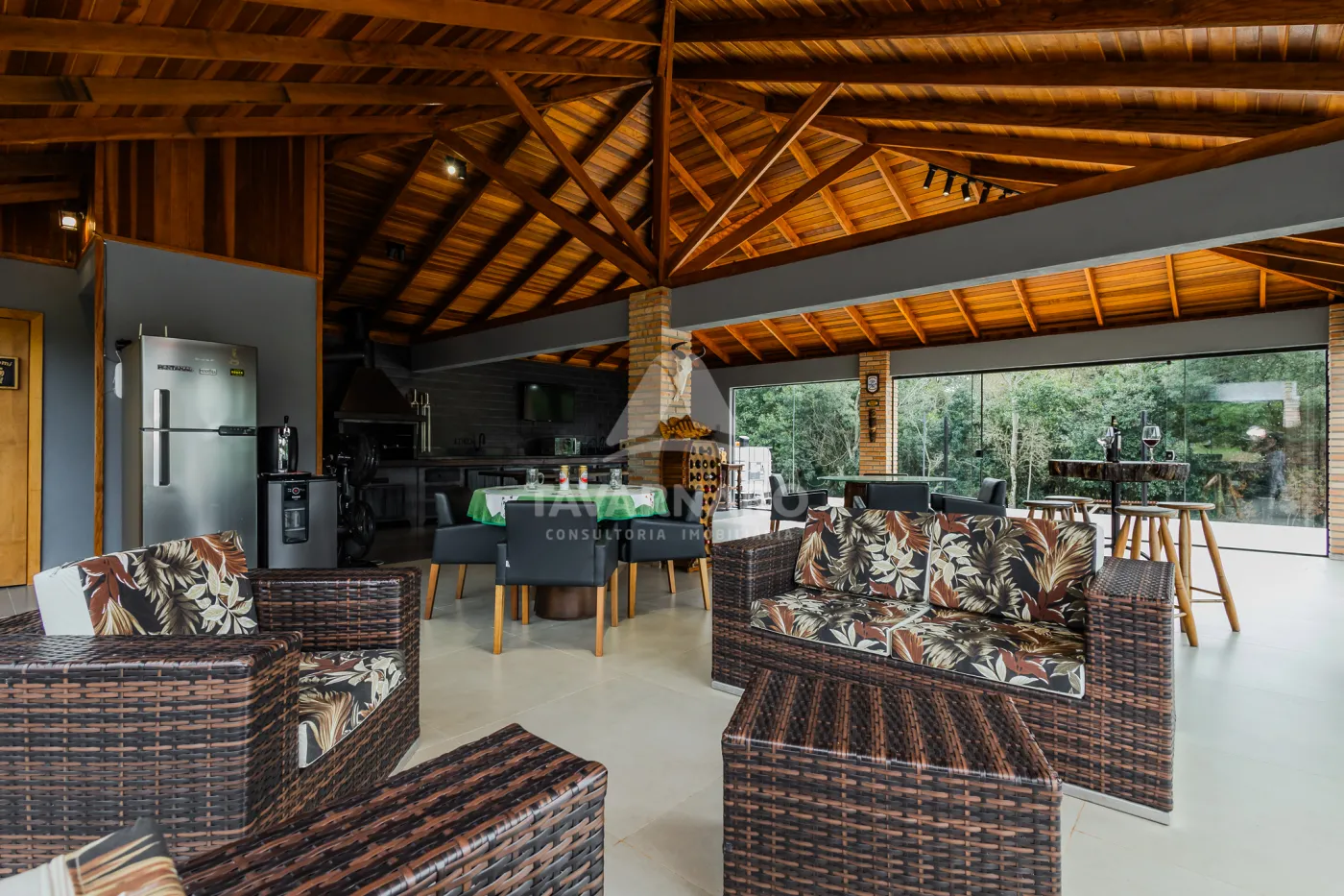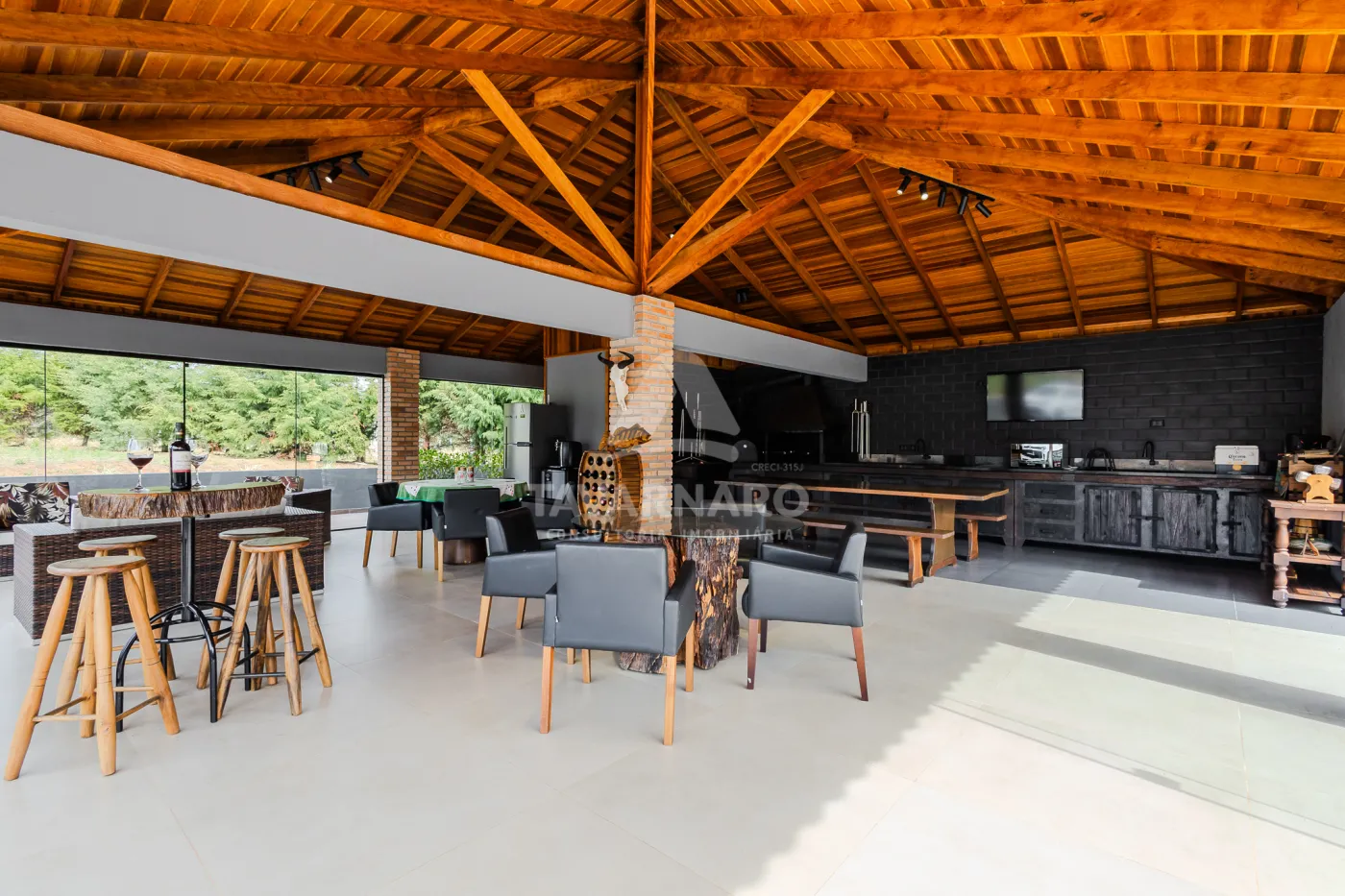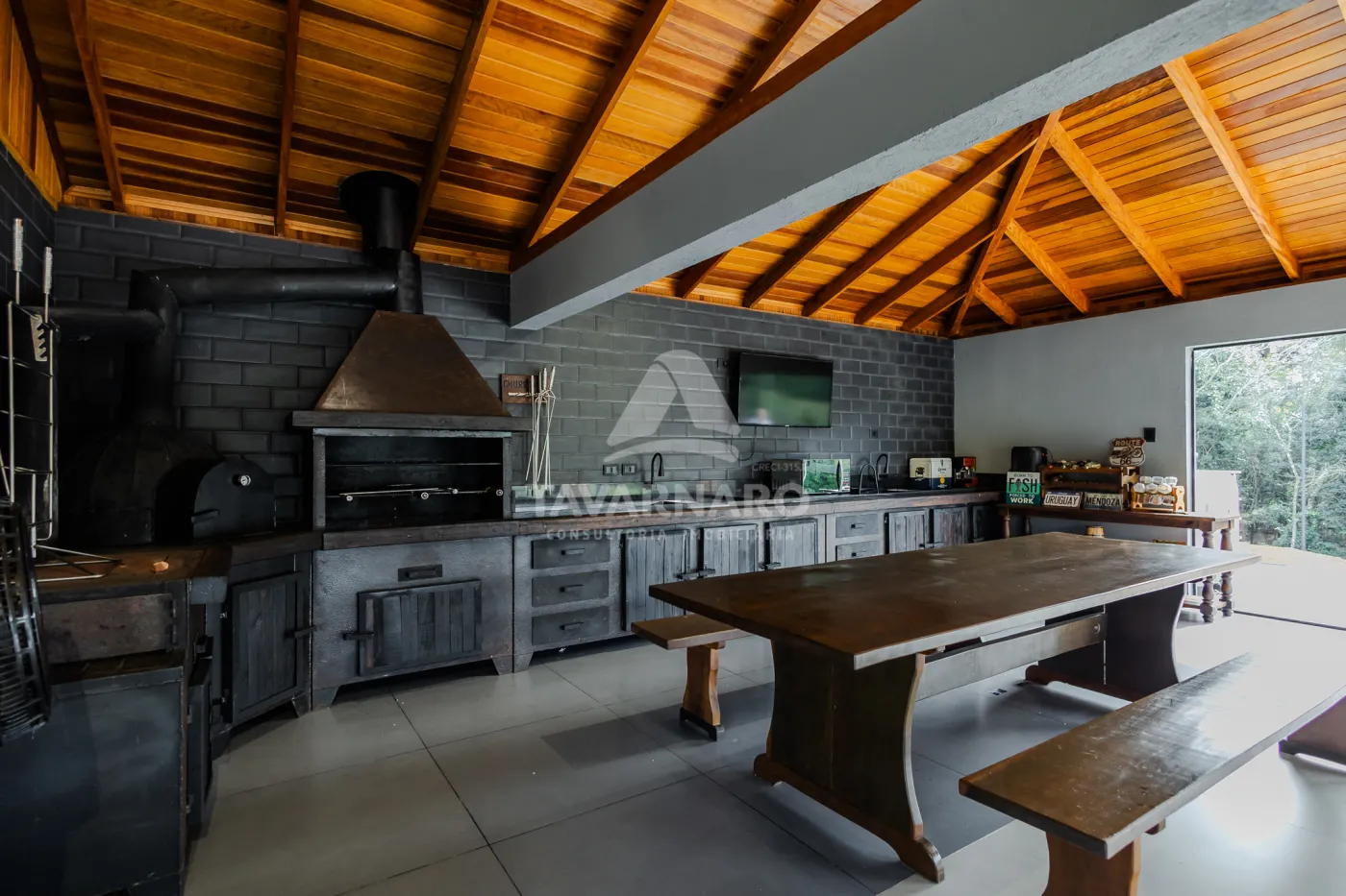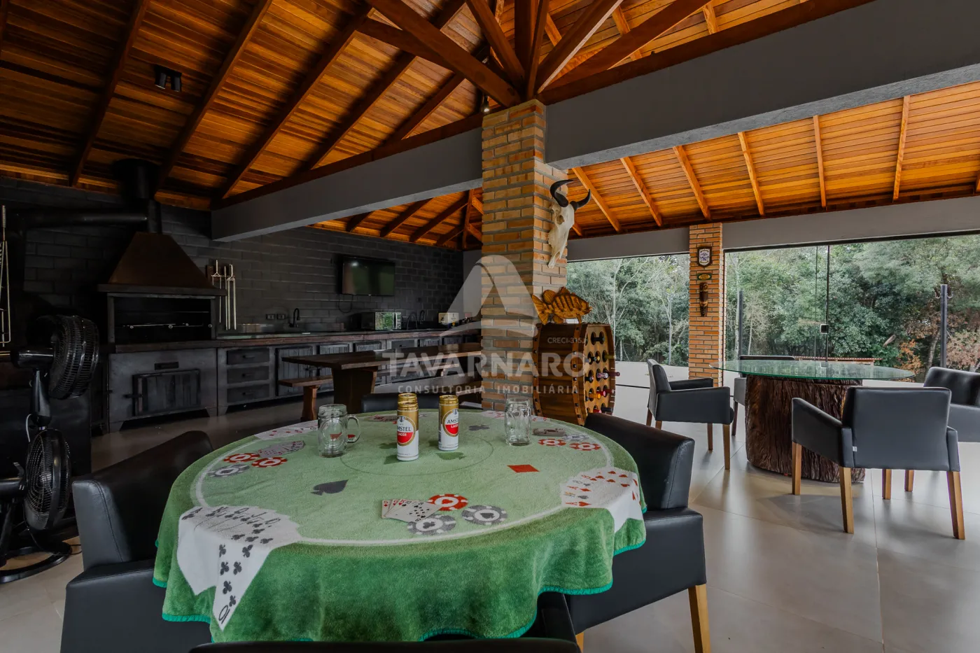 - armários planejados, eletros, mesas, cadeiras, banquetas, TV, lareira externa, louças, adega para vinhos em madeira.