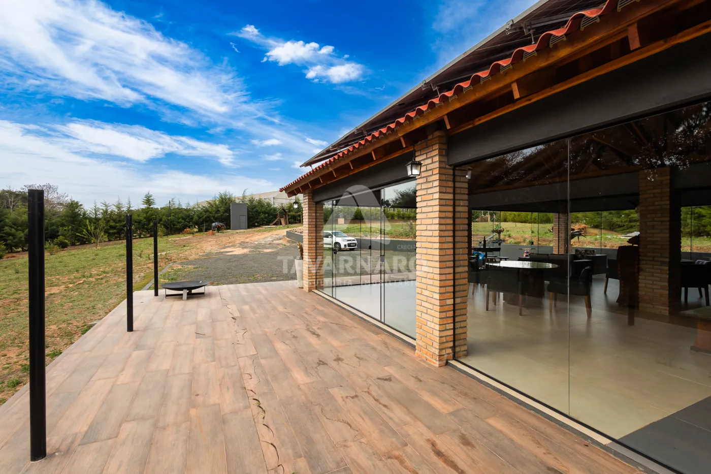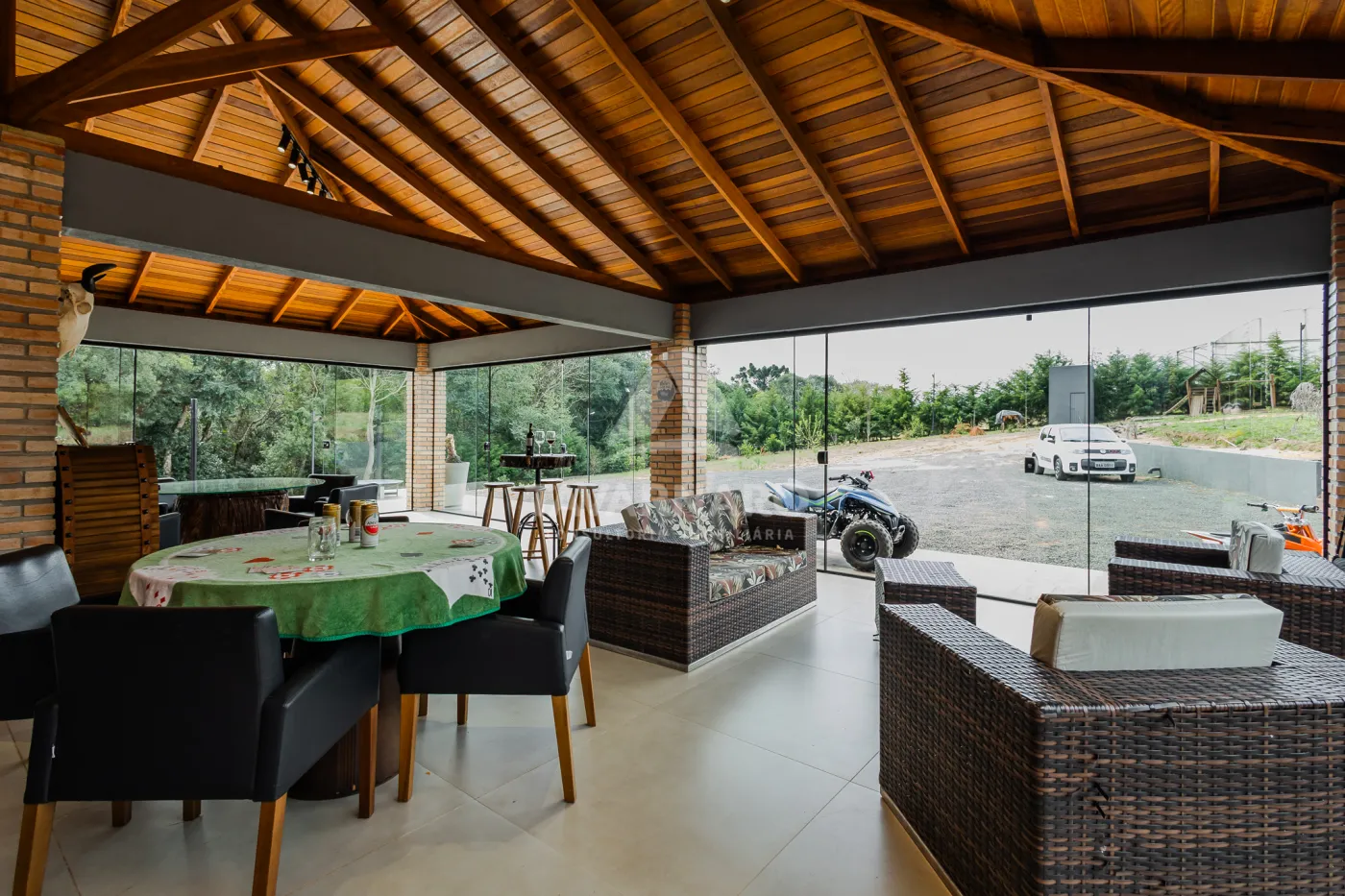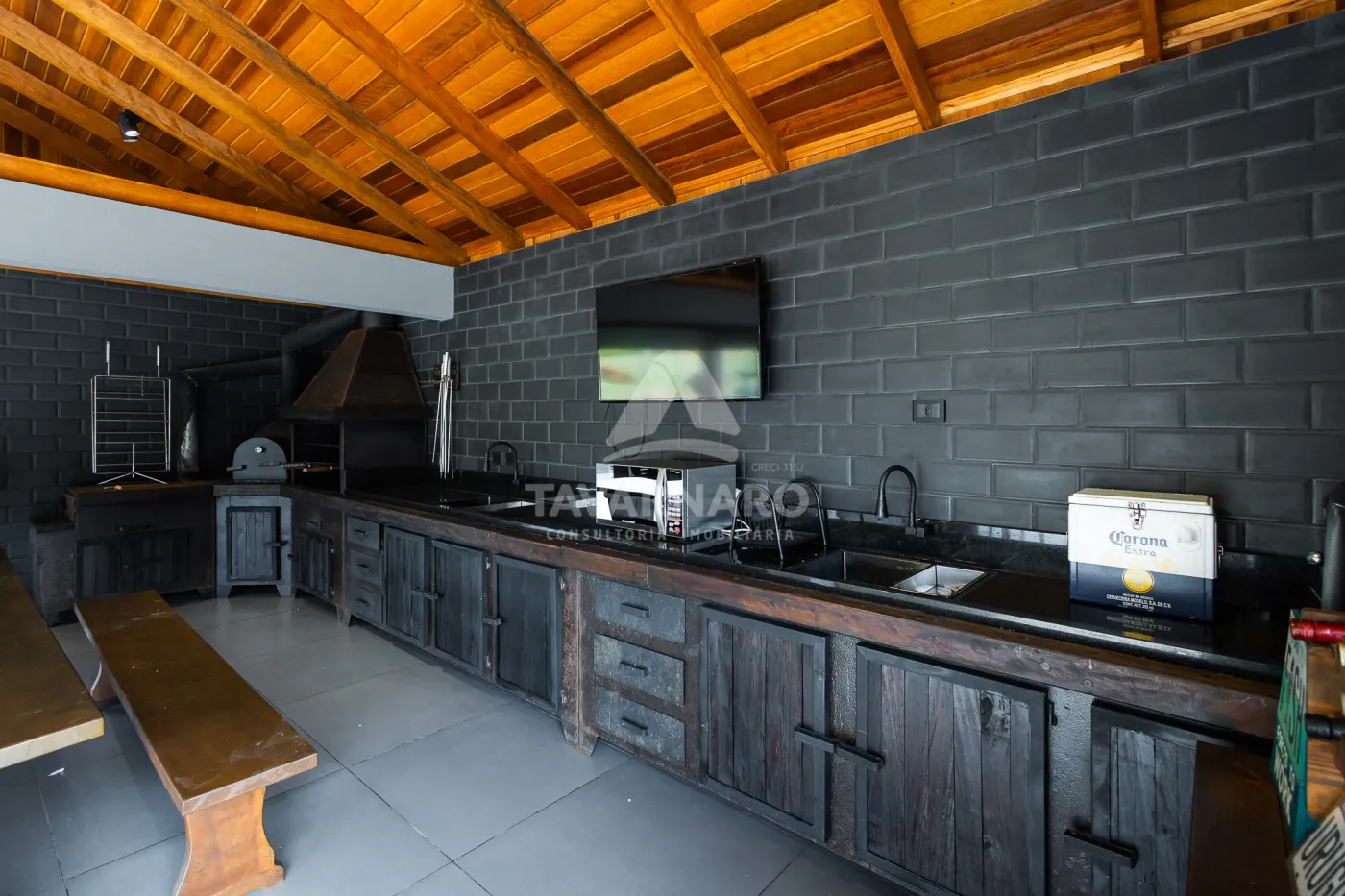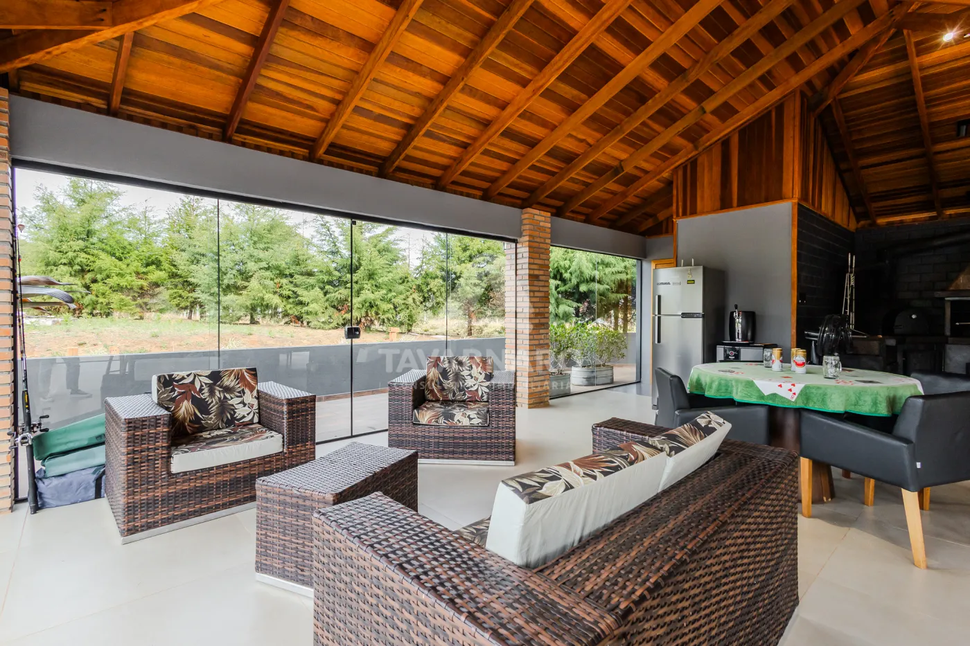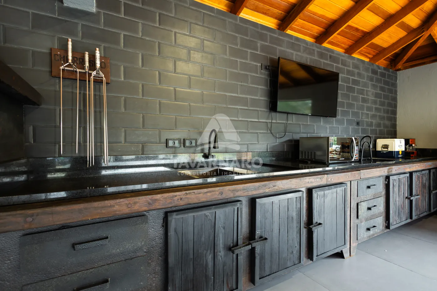 - armários planejados, eletros, mesas, cadeiras, banquetas, TV, lareira externa, louças, adega para vinhos em madeira.